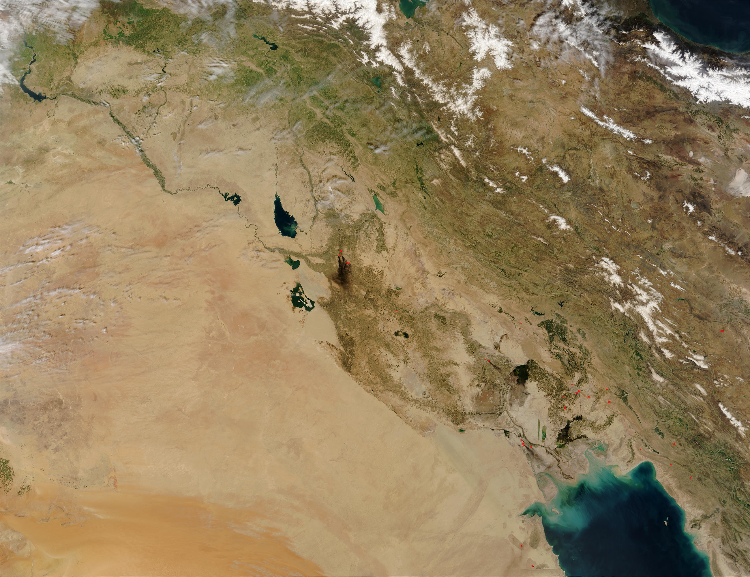 It is not unusual for MODIS to detect thermal signatures at oil wells or refineries. Underground, great pressure keeps various flammable gases mixed in with the liquid oil. When the oil is brought to the surface where air pressure isn't as great, those gases bubble up out of the oil are typically burned off, giving off a thermal signature and sometimes smoke. Other processes of oil production and refinement produce detectable thermal signatures. The hot spots detected in a roughly diagonal line from the bottom right of the image may be from oil production and refinement. The plumes of smoke coming from the locations in southern Iraq, however, are larger than what MODIS typically sees.