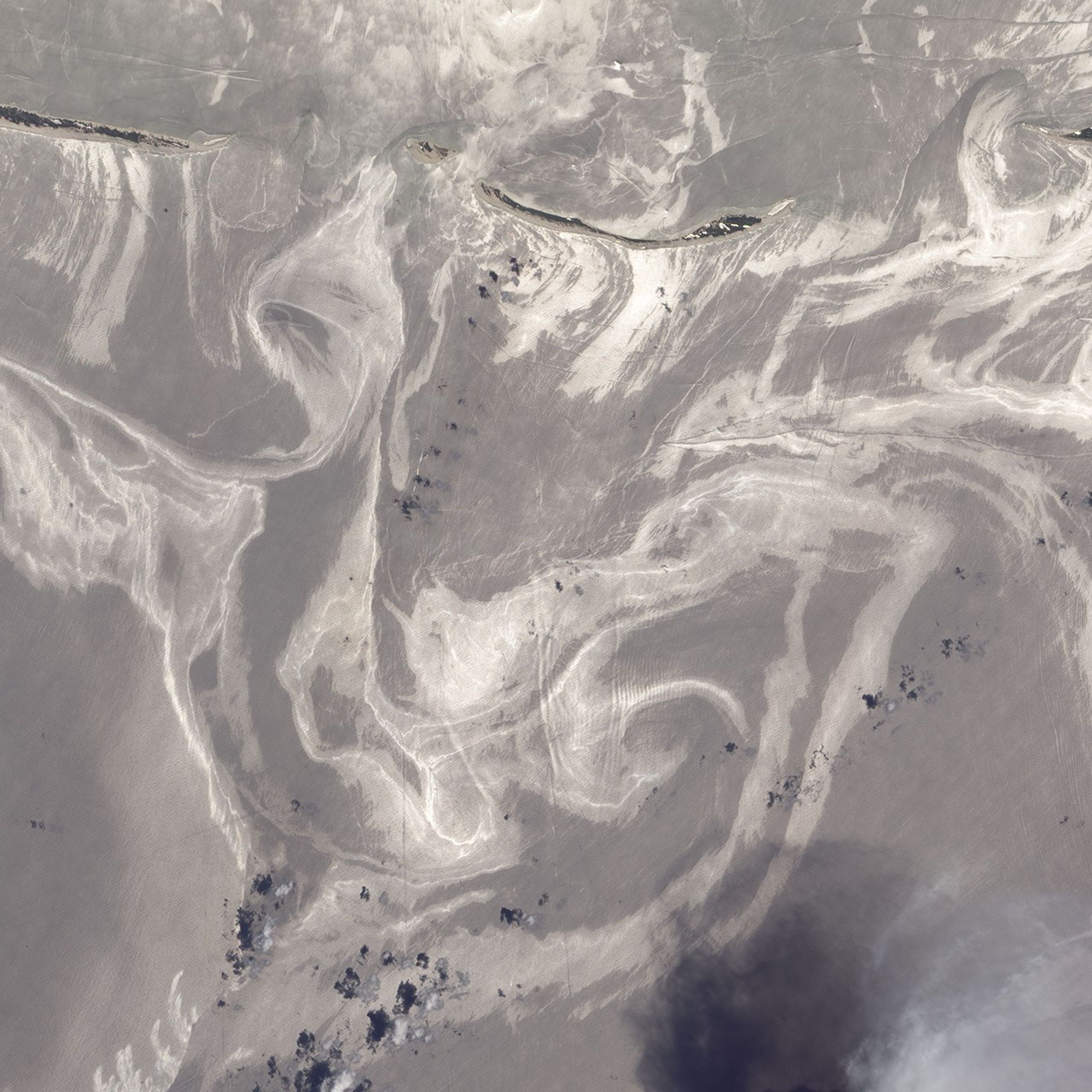 This high-resolution image shows Petit Bois Island (top right) and the eastern end of Horn Island (top left) on June 26. In general, oil-covered waters are silvery and cleaner waters are blue-gray. This pattern is especially consistent farther from the islands. The intensely bright patches of water directly offshore of the barrier islands, however, may be from a combination of factors, including sediment and organic material, coastal currents and surf, and oil.