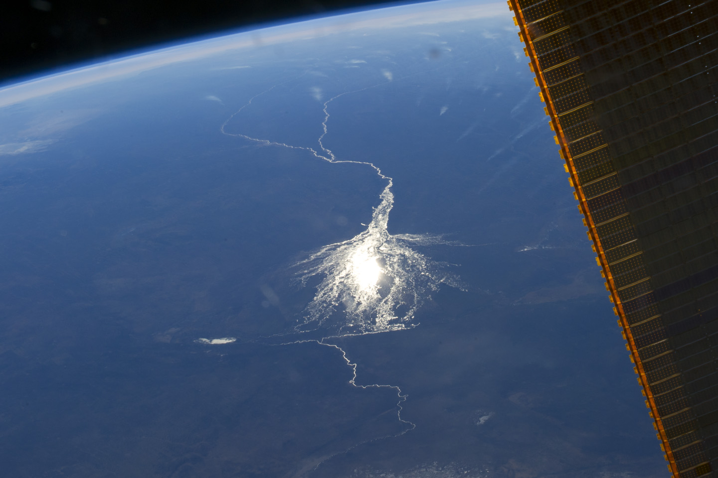 The great Okavango Delta in the Kalahari Desert is illuminated in the Sun’s reflection point in this panorama taken from the International Space Station (ISS). Using this sunglint technique, astronauts can capture the fine detail of water bodies.