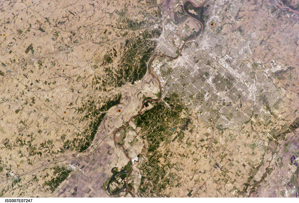This photograph was taken by the Expedition 7 crew of the International Space Station on June 13, 2003, and is among the first acquisitions of an ongoing effort to document from space dozens of historical sites along the Lewis and Clark Expedition’s entire route. In this near-vertical view of Omaha—with a population estimated at more than three quarters of a million residents—the city is situated on high ground to the west of the river while Eppley Airfield and the town of Council Bluffs are located on the floodplain.