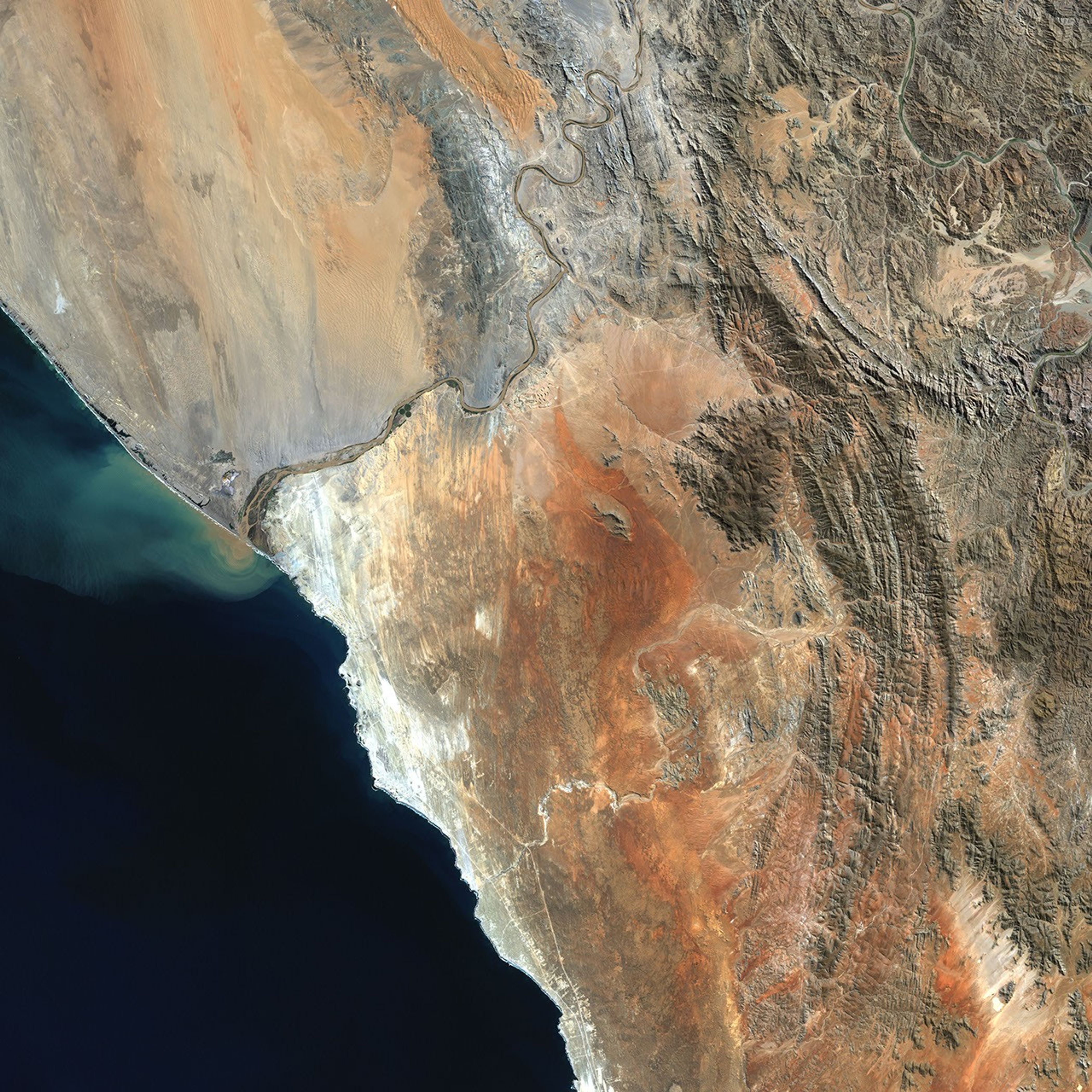 This image shows only the last 100 kilometers or so of the Orange River, which is born in the Drakensberg Mountains on the eastern side of the continent and snakes more than 2,000 kilometers across South Africa. In this last stretch the gravel deposits in the river bed and along the banks are rich with diamonds, and several diamond mines operate along the stretch pictured here.