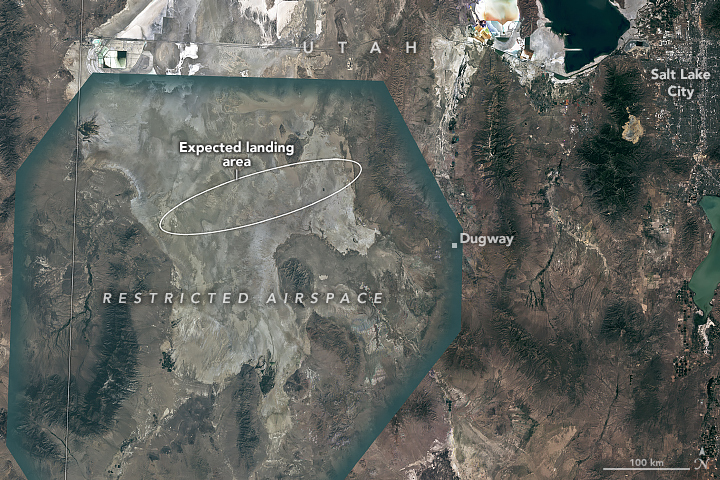 Before it can do that, the sample’s protective capsule will withstand temperatures twice as hot as lava, and the second-fastest velocity ever achieved by a human-made object entering Earth’s atmosphere. After entering Earth’s atmosphere at around 36 times the speed of sound, the capsule may eventually encounter wind, rain, and other weather conditions as it drops closer to the surface. Regardless of weather, it will land in the Great Salt Lake Desert, an arid landscape known for its scorching summer temperatures and its salt flats, the remnants of an ancient lakebed where crusty salt deposits coat the ground.