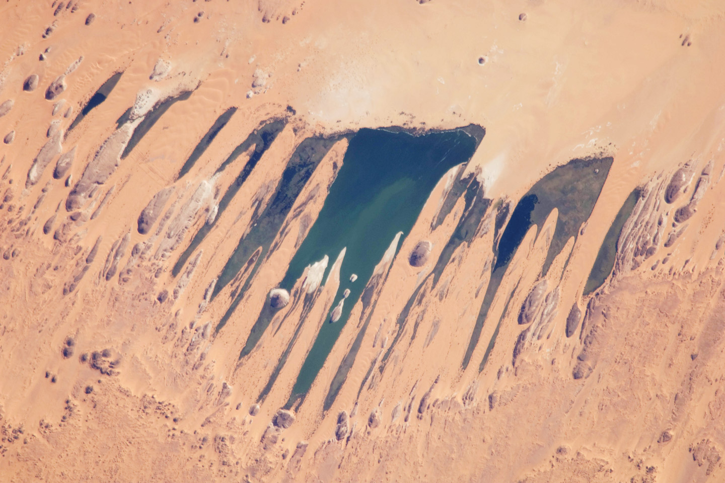 This astronaut photograph features one of the largest of a series of ten mostly fresh water lakes in the Ounianga Basin in the heart of the Sahara Desert of northeastern Chad. The lakes are remnants of a single large lake, probably tens of kilometers long, that once occupied this remote area approximately 14,800 to 5,500 years ago. As the climate dried out during the subsequent millennia, the lake shrank, and large, wind-driven sand dunes invaded the original depression, dividing it into several smaller basins.