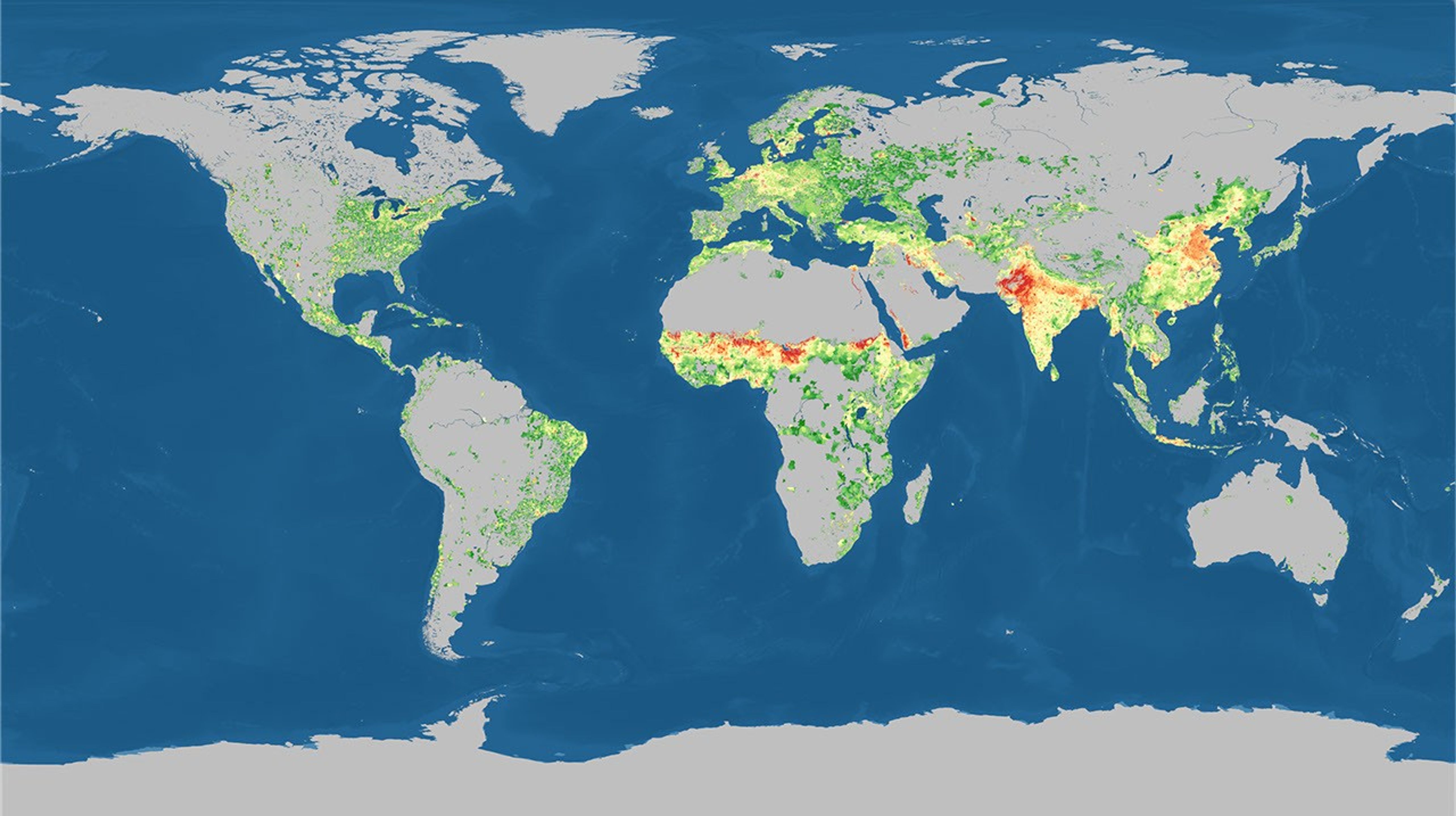 This map shows the comparison for 2005. The colors represent the ratio between the amount of carbon people require and the amount of carbon Earth produced. At the top of the scale (dark red), the population needs at least ten times more plants than are grown locally. At the lower end of the scale (dark green), the land produces more vegetation that the local population needs. Gray areas are places where people in the area use less than 10 percent of the vegetation growing there. In the center of the scale (pale yellow) people use most of the vegetation.
