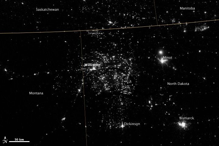 Chris Elvidge is particularly interested in the view of combustion sources — such as wildfires and gas flares — which glow in different wavelengths than manmade lights. His team can distinguish between the two by simultaneously using visible light and short-wave infrared bands. “We’re detecting much smaller gas flares with VIIRS than we could with DMSP, and we’re able to estimate the temperature and the total radiant output.” Elvidge hopes the measurements could eventually lead to better estimates of carbon dioxide emissions.