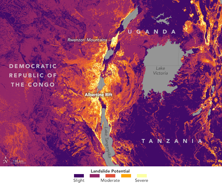 One area with unusually high susceptibility is the Albertine Rift in Central and Eastern Africa. The rift sits at the center of a zone of notably high potential for landslides because it is flanked by highlands such as the Rwenzori Mountains. Deforestation, large numbers of faults, and regular rains all contribute to landslide potential in this area.