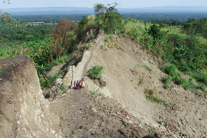 The photograph above shows children standing in the debris of a deep landslide in Bundibugyo, a district in western Uganda. While the slopes in this part of the Rwenzori are not particularly steep, they are quite susceptible to landslides because of the clay-rich soil in the area. It was taken by Jacobs on March 9, 2016.
