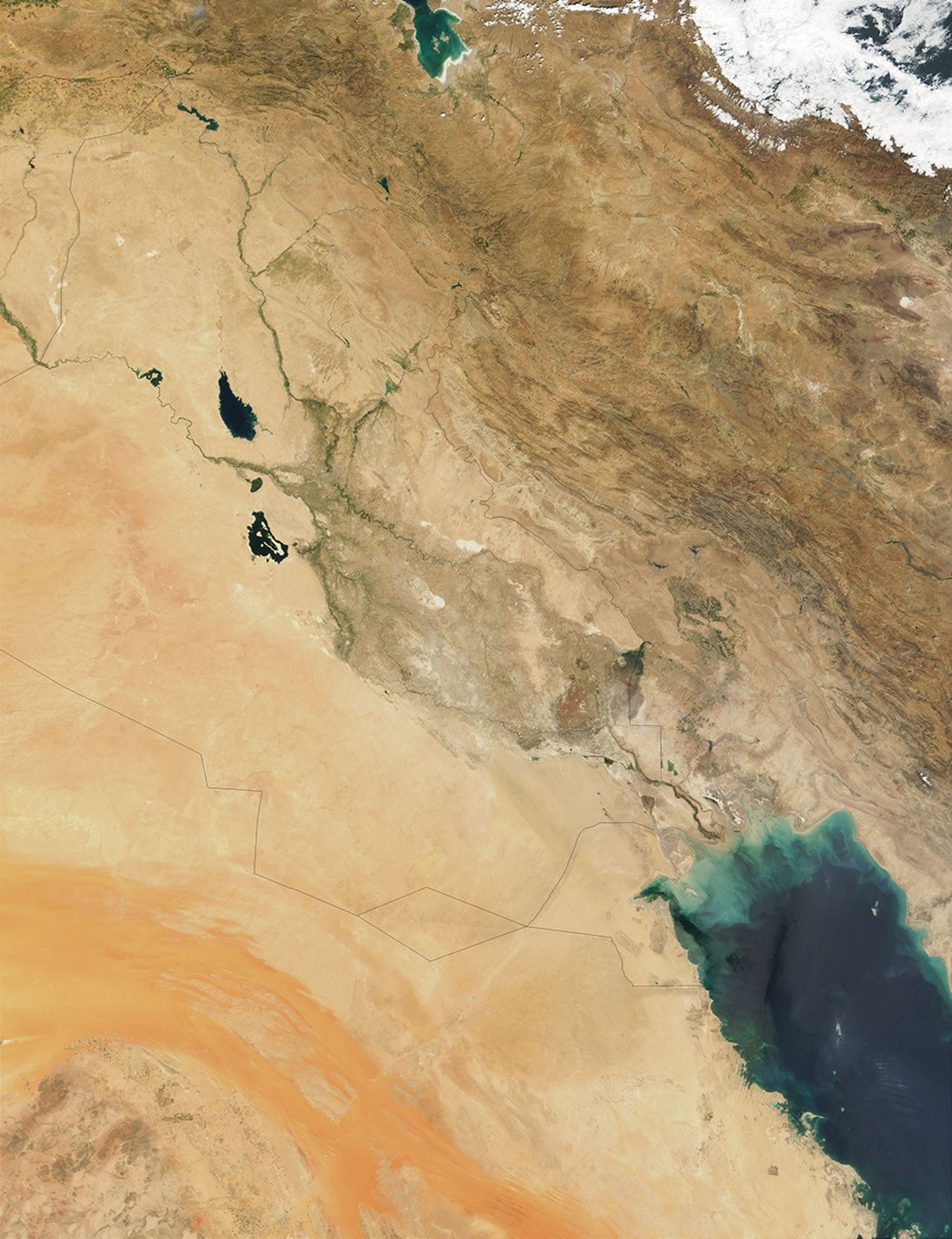 Running through the deserts of Iraq (image center) are the Tigris(right) and Euphrates (left) Rivers. The land between the confluence ofthe two rivers is the culturally, historically, and ecologicallysignificant Mesopotamian Fertile Crescent, situated just southeast ofcenter in this true-color image from NASA’s Moderate-resolutionImaging Spectroradiometer (MODIS), acquired on August 29, 2001. Recent reports estimate that within the pasttwo decades, over 85 percent of the wetlands making up the FertileCrescent have disappeared due to demand for irrigation in theregion.