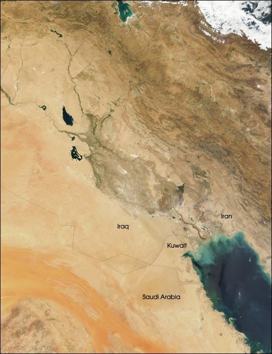 Several manmade features are also apparent. At Iraq’s southeasternborder with Kuwait, burning oil smoke is visible. Crisscrossing thedeserts of southern Iraq and Saudi Arabia are white lines that revealthe location of oil pipelines. The unusual polygonal shapes that appearto the east of the Ad Dahna’ are areas that are protected fromgrazing.