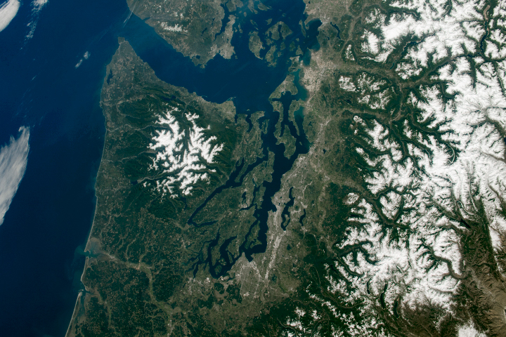 This photograph, taken by an astronaut from the International Space Station (ISS), illustrates several environmental wonders and highlights of the Pacific Northwest of the United States.