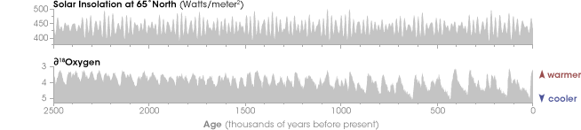 (Lower graph) Oxygen isotopes trapped in ocean sediments record cycles of ice ages millions of years into Earth’s past. This climate record matches the frequency of orbital changes, although tangled feedbacks make the relationship complex. Dips represent ice ages, and spikes represent interglacials. (Graph by Robert Simmon, based on data from Berger 1992 and Lisiecki 2005.)