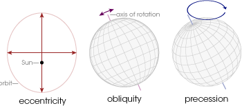 The Earth circles the Sun in a flat plane. It is as if the spinning Earth is also rolling around the edge of a giant, flat plate, with the Sun in the center. The shape of the Earth’s orbit—the plate—changes from a nearly perfect circle to an oval shape on a 100,000-year cycle (eccentricity). Also, if you drew a line from the plate up through the Earth’s North and South Poles—Earth’s axis—the line would not rise straight up from the plate. Instead the axis is tilted, and the angle of the tilt varies between 22 and 24 degrees every 41,000 years (obliquity). Finally, the Earth wobbles on its axis as it spins. Like the handle of a toy top that wobbles toward you and away from you as the toy winds down, the “handle” of the Earth, the axis, wobbles toward and away from the Sun over the span of 19,000 to 23,000 years (precession). These small variations in Earth-Sun geometry change how much sunlight each hemisphere receives during the Earth’s year-long trek around the Sun, where in the orbit (the time of year) the seasons occur, and how extreme the seasonal changes are.