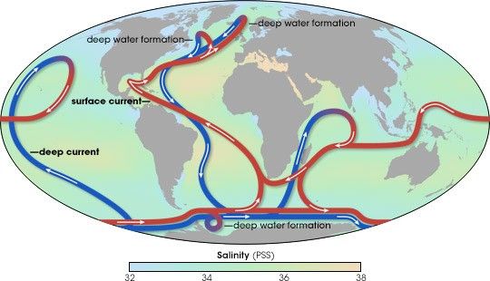 This map shows the general location and direction of the warm surface (red) and cold deep water (blue) currents of the thermohaline circulation. Salinity is represented by color in units of the Practical Salinity Scale. Low values (blue) are less saline, while high values (orange) are more saline. (Map by Robert Simmon, adapted from the IPCC 2001 and Rahmstorf 2002.)
