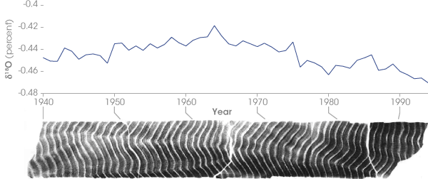 Correcting for the Skew: Scientists can correct for the temperature factor by looking at other chemicals in the shells. In coral, for example, the balance between strontium and calcium is determined by temperature. By measuring the amounts of these chemicals in the coral, scientists can determine the ocean’s temperature, then calculate how much more heavy oxygen the shells were likely to incorporate at that temperature. Discrepancies in the oxygen isotope ratio after the temperature correction reveal changes in the ocean’s local salinity, which is related to evaporation, rainfall and runoff, and global salinity—a measure of the total amount of ice in the world.