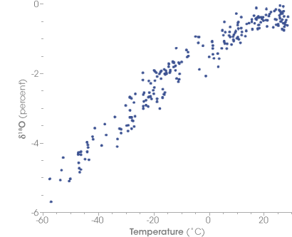 Correcting for the Skew: Scientists can correct for the temperature factor by looking at other chemicals in the shells. In coral, for example, the balance between strontium and calcium is determined by temperature. By measuring the amounts of these chemicals in the coral, scientists can determine the ocean’s temperature, then calculate how much more heavy oxygen the shells were likely to incorporate at that temperature. Discrepancies in the oxygen isotope ratio after the temperature correction reveal changes in the ocean’s local salinity, which is related to evaporation, rainfall and runoff, and global salinity—a measure of the total amount of ice in the world.