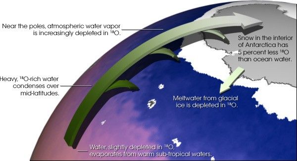 Ocean waters rich in heavy oxygen: During ice ages, cooler temperatures extend toward the equator, so the water vapor containing heavy oxygen rains out of the atmosphere at even lower latitudes than it does under milder conditions. The water vapor containing light oxygen moves toward the poles, eventually condenses, and falls onto the ice sheets where it stays. The water remaining in the ocean develops increasingly higher concentration of heavy oxygen compared to the universal standard, and the ice develops a higher concentration of light oxygen. Thus, high concentrations of heavy oxygen in the ocean tell scientists that light oxygen was trapped in the ice sheets. The exact oxygen ratios can show how much ice covered the Earth.
