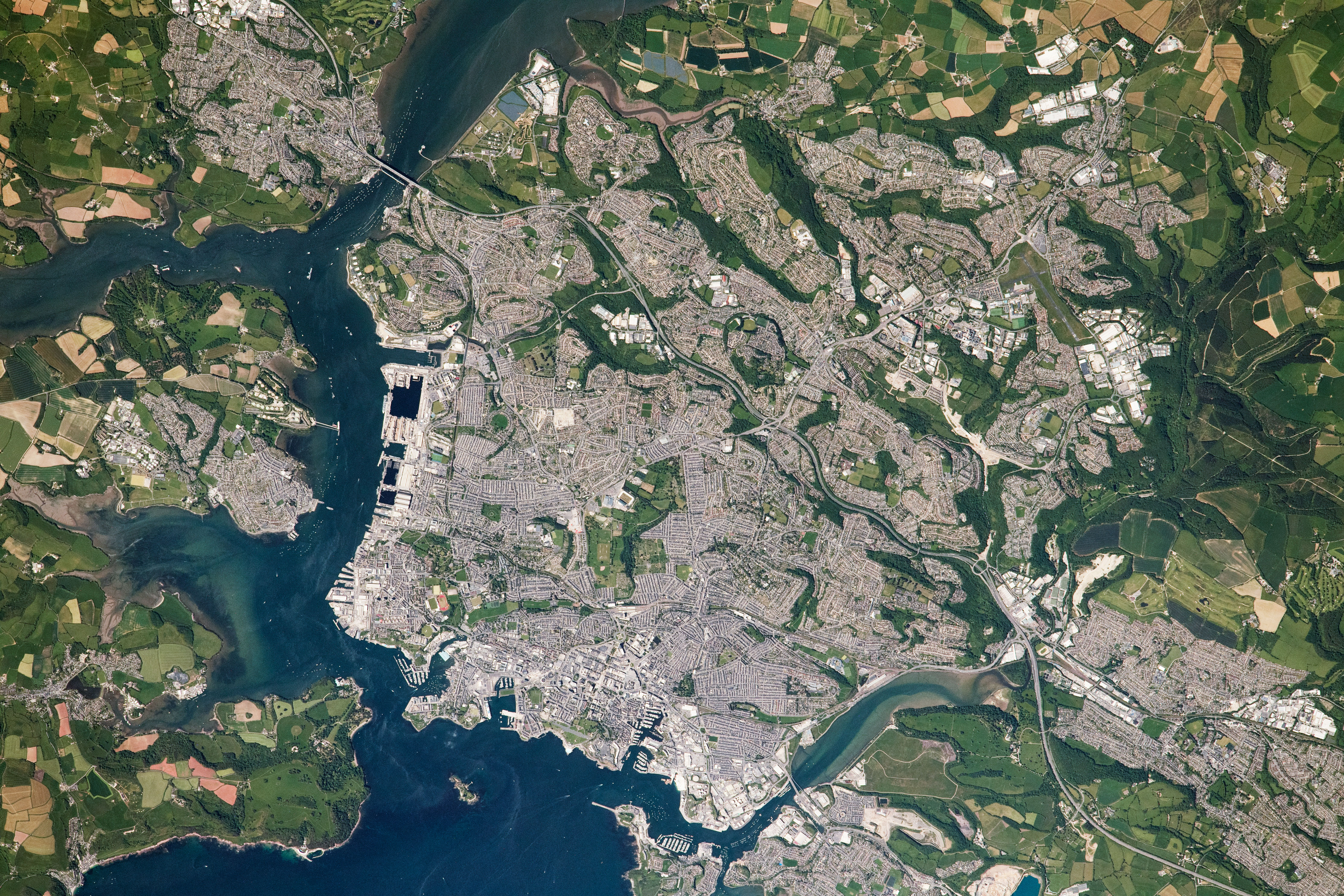 Astronaut photograph ISS065-E-93706 of Plymouth, U.K., was acquired on June 8, 2021, with a Nikon D4 digital camera using an 1150 millimeter lens. Astronaut photograph ISS065-E-124634 of Plymouth, MA, was acquired on June 18, 2021, with a Nikon D4 digital camera using a 50 millimeter lens. Both images were provided by the ISS Crew Earth Observations Facility and the Earth Science and Remote Sensing Unit, Johnson Space Center, and were taken by a member of the Expedition 65 crew . These images have been cropped and enhanced to improve contrast, and lens artifacts have been removed. The International Space Station Program supports the laboratory as part of the ISS National Lab to help astronauts take pictures of Earth that will be of the greatest value to scientists and the public, and to make those images freely available on the Internet. Additional images taken by astronauts and cosmonauts can be viewed at the NASA/JSC Gateway to Astronaut Photography of Earth . Story by Sara E. Pratt .