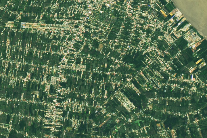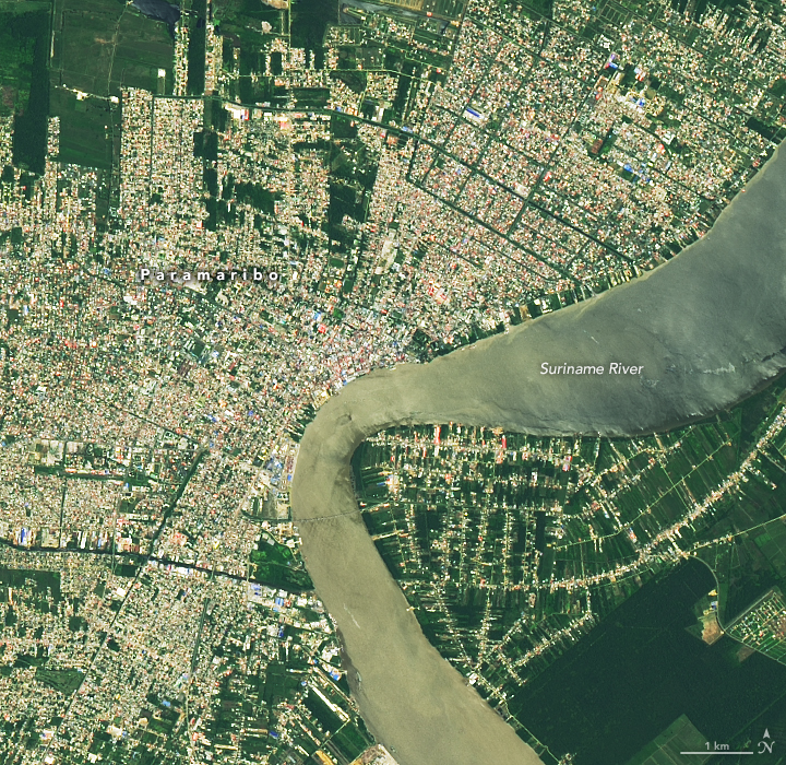 On September 10, 2020, the Operational Land Imager (OLI) on Landsat 8 acquired this natural-color image of the city. Paramaribo is centered on the west bank of the Suriname River, with the historic city center and main port located along the sharp bend in the center of the image. The image below shows neighborhoods south of Paramaribo in the Wanica district along the Tout Lui Faut canal. An oil refinery and port facilities are visible at the end of the canal along the river’s edge.