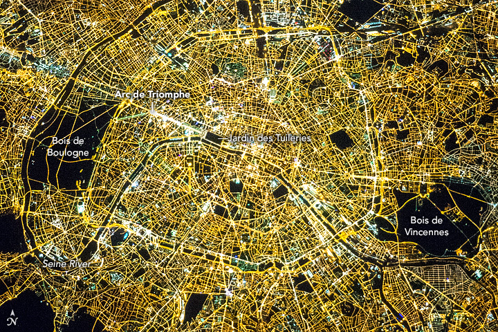 The pattern of the street grid dominates at night, providing a completely different set of visual features from those visible during the day. For instance, the winding Seine River is a main visual cue by day, but here the thin black line of the river is hard to detect until you focus on the strong meanders and the street lights on both banks.