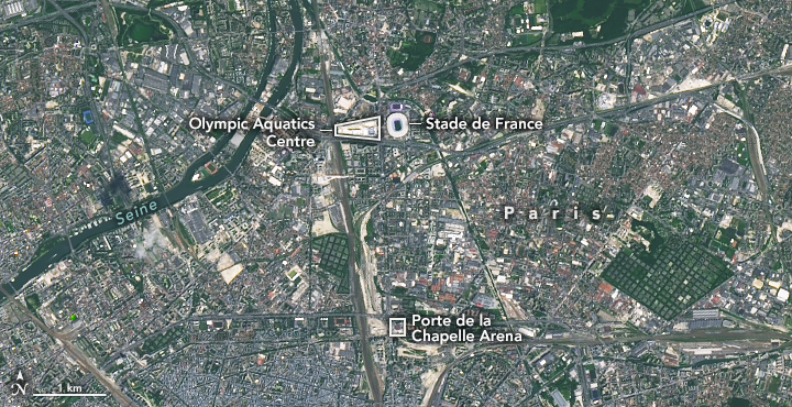 The image above highlights venues located along the Seine River, the main artery of Paris. The opening ceremony, scheduled for July 26, will take place along the river rather than in a stadium. Traveling on large boats, about 10,500 athletes will wind their way from east to west through the center of the city. The 6-kilometer parade route ends in front of the Trocadéro, across the Seine from the Eiffel Tower, where the ceremony’s remaining shows will take place.