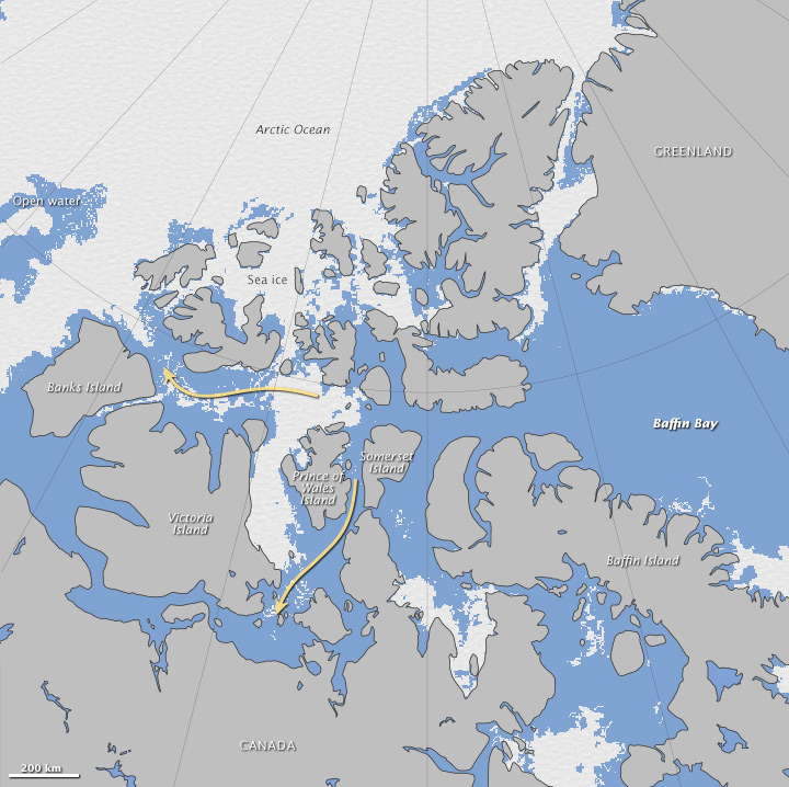 The northern passage runs through Lancaster Sound, Parry Channel, and McClure Strait—waterways that are wider, deeper, and more suited to large ships. In the satellite images above, the Parry Channel is filled with a melange of sea ice, though it does not appear to be completely frozen over. According to an August 31 analysis by the Multisensor Analyzed Sea Ice Extent (MASIE) product (created by the U.S. National Ice Center and posted by the National Snow and Ice Data Center) the northern route was considered mostly ice-filled for the sake of navigation. See the MASIE map below.