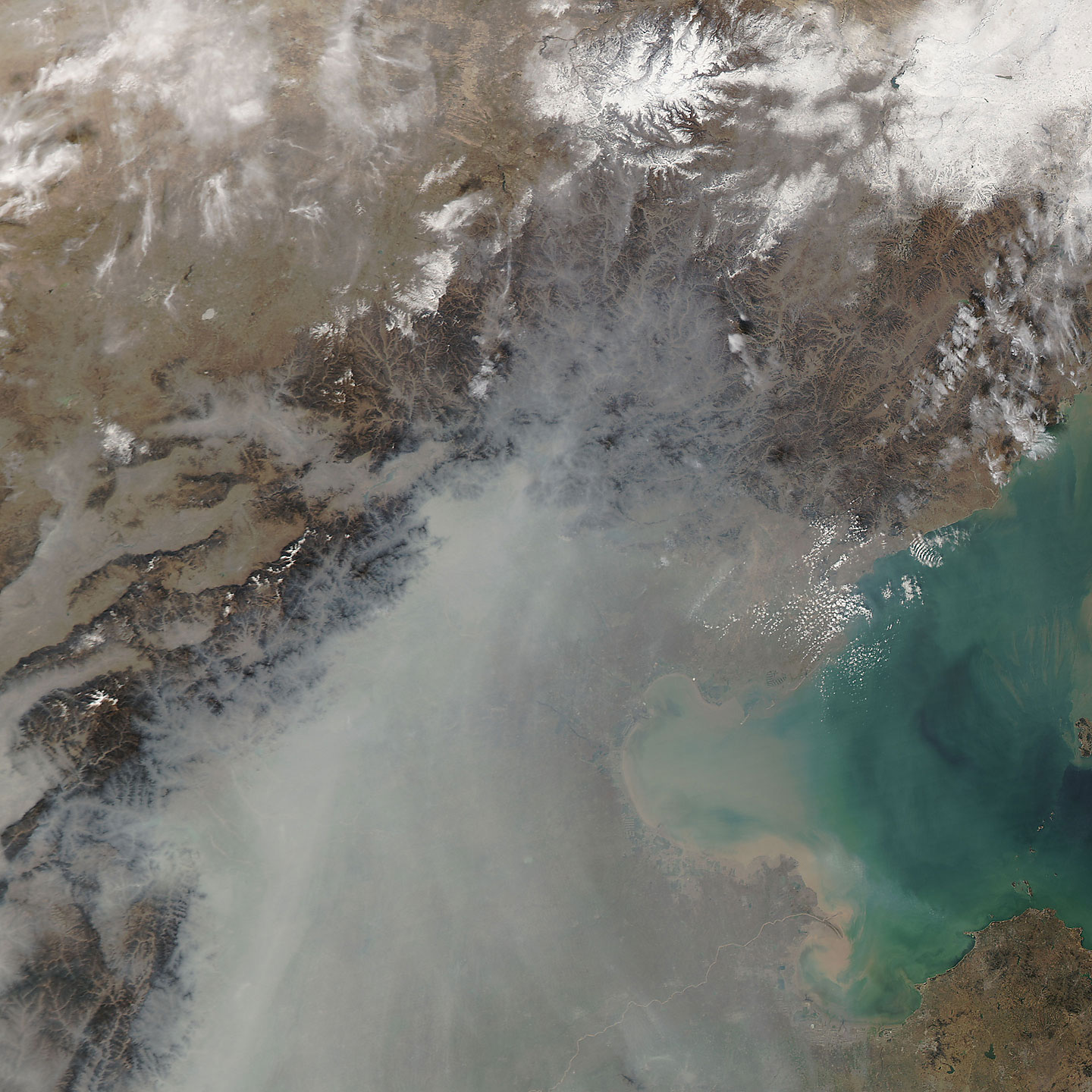 Between the afternoon of November 2 and November 3, a layer of haze built up in east-central China near the coast of Bo-Hai (the body of water at right). The east coastal plain in this part of China is frequently plagued with poor air quality, due to increasing vehicle pollution in large cities like Beijing, coal-fired power plants, and home heating and cooking fires. The location and topography do not help the situation. The mountains to the west trap the haze over the plain, and the meteorological influences in the area often create what's called a "temperature inversion," in which the air near the surface is cooler than the air higher in the atmosphere. (Normally, air temperatures decrease with altitude.) Since cooler air has less tendency to rise, the haze can remained trapped near the surface until the weather changes.