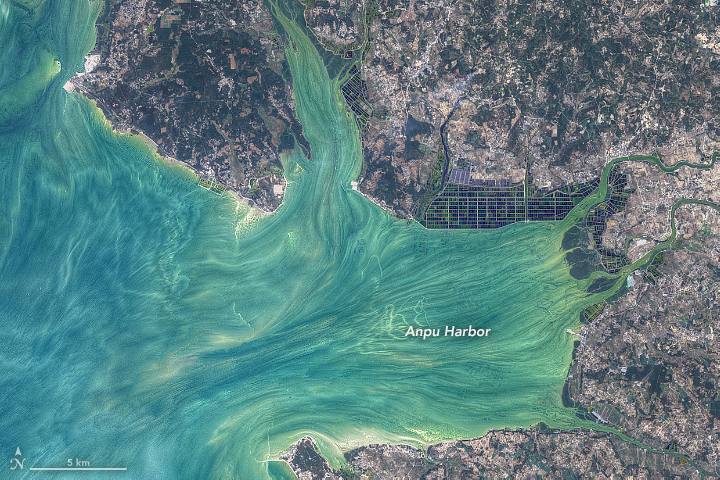 Numerous bays, harbors, and estuaries line more than 1500 kilometers of coastline along the peninsula. Two on the peninsula’s western side—Anpu Harbor and Liusha Bay—are visible in the detailed images below.