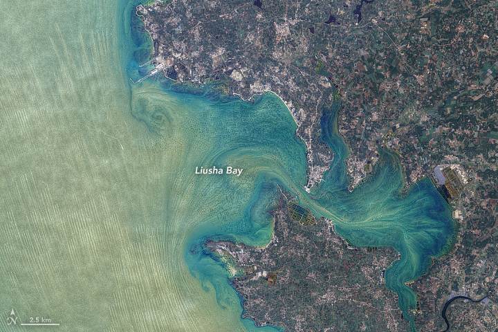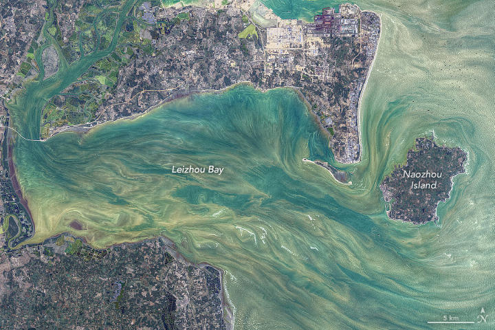 Waters east of the peninsula also display complex patterns. In Leizhou Bay (above), sediment-laden river water contributes to the colorful swirls. Sediment from the Pearl River Delta, about 400 kilometers (250 miles) to the northeast, might also contribute.