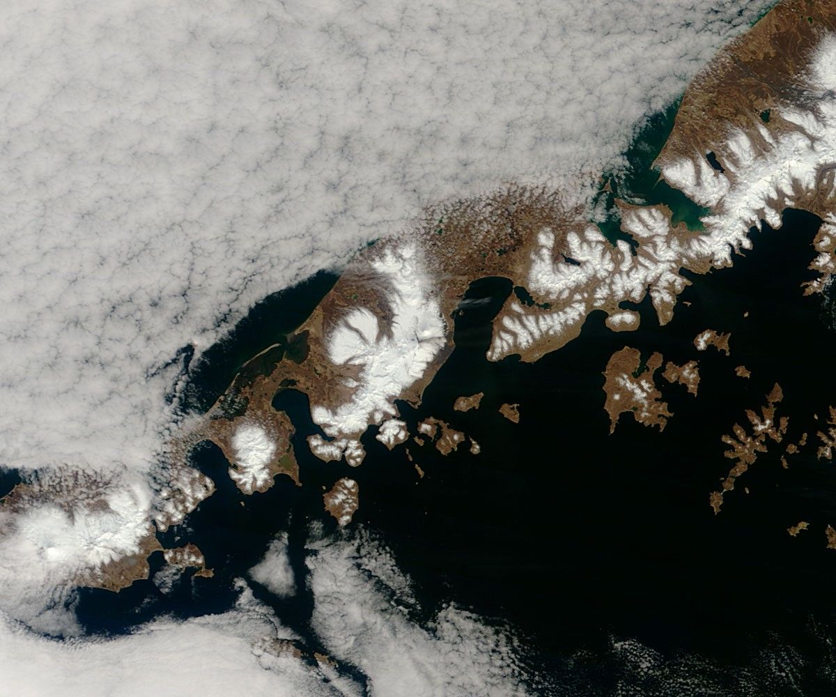 For the third time this century, Alaska’s Pavlof Volcano is erupting. The Alaska Volcano Observatory first detected earthquakes associated with the movement of magma and heat at Pavlof’s summit on May 13, 2013. The Moderate Resolution Imaging Spectroradiometer (MODIS) on the Terra satellite captured this image of a small ash plume and lava flow on the morning of May 14.