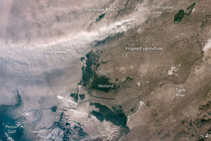 The dust plume is also an excellent example of the interconnected nature of Earth’s systems. Extensive irrigation in southern Iraq has progressively reduced the areas exposed directly to wind erosion. Thus the amount of dust being transported to Saudi Arabia has decreased over time—probably since irrigated agriculture began here several thousand years ago.