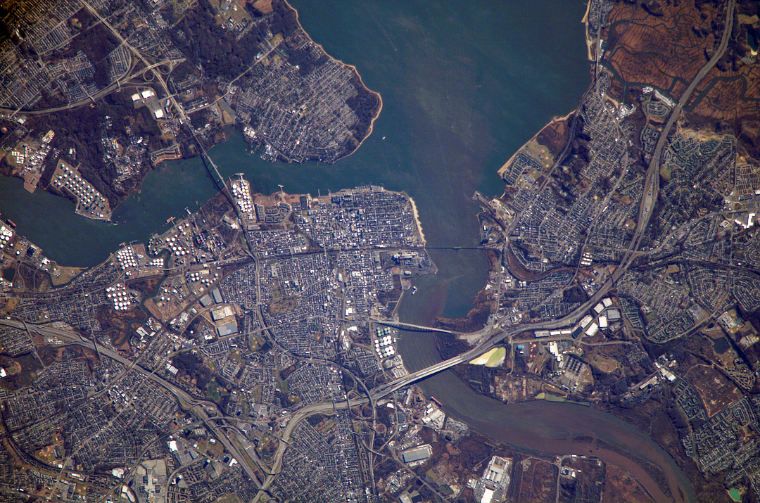 The port city of Perth Amboy is located between the outlets of the Raritan River and Arthur Kill (kill is “river” in Dutch) into Raritan Bay in upper New Jersey. Rich clay beds in the region, formed during the Cretaceous Era (about 65–144 million years ago), provided raw materials for numerous pottery and terra cotta manufacturers during the nineteenth century. The city was an industrial and shipping center and a resort destination through the early to mid-twentieth century. While the majority of the industrial factory facilities have left Perth Amboy, petroleum processing and storage remains part of the economic base. Several refining facilities are visible along the banks of Arthur Kill in this astronaut photograph (image upper left).