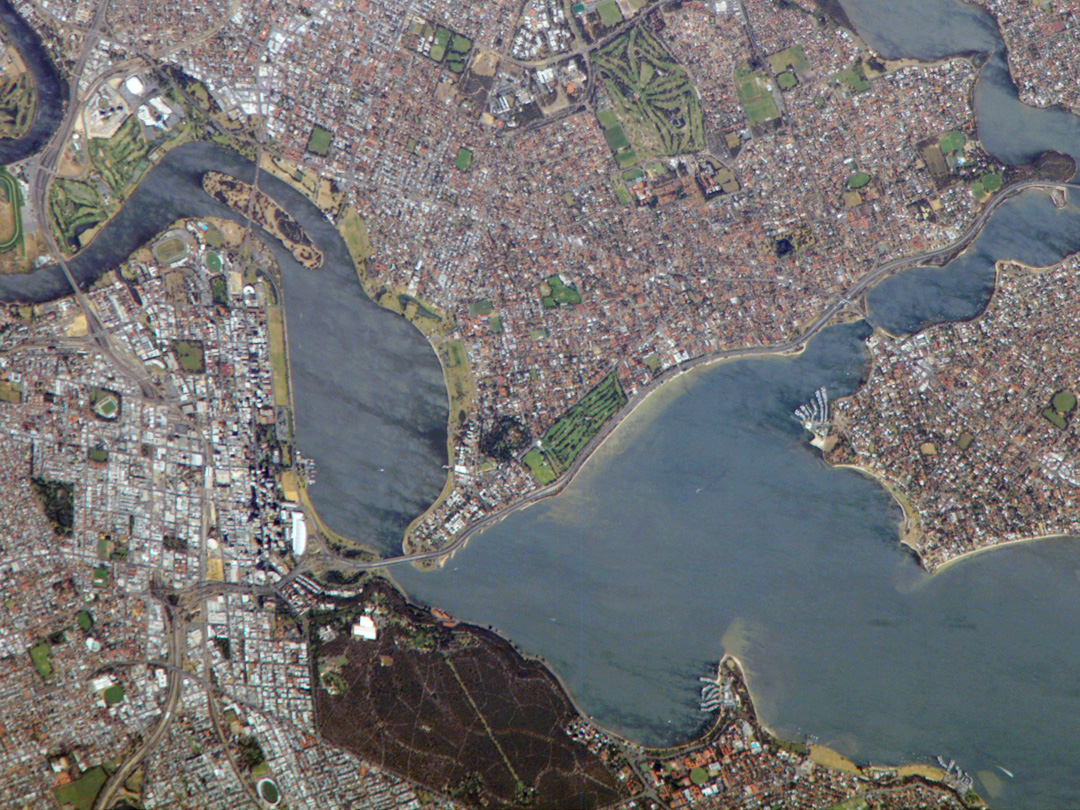 This astronaut photograph captures variations in urban land cover around Perth. The downtown center of the city (image left) is characterized by large buildings (such as skyscrapers) with white, reflective rooftops. Suburbs to the south (across the Swan River) are characterized by higher density of small buildings with predominantly reddish-purple roofs. Several areas of green vegetation are visible in the image. Parks and golf courses comprised mainly of grass present an even, green coloration, while the dense tree canopy of Kings Park appears dark green. Variations in the color of the Swan and Canning Rivers is due to sunglint, or light reflected off the water surface directly back to the observer (in this case, an astronaut about the International Space Station) like a mirror.