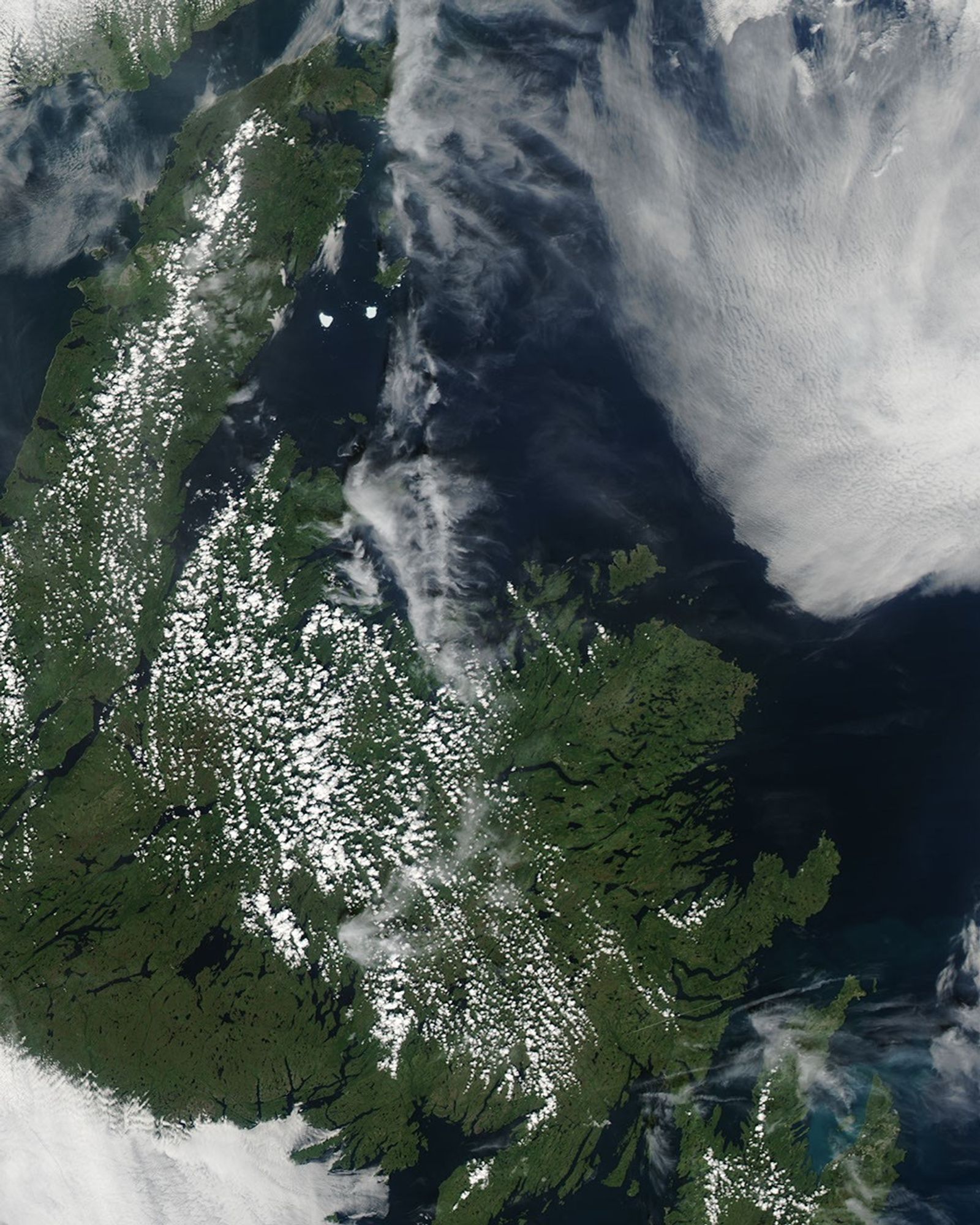 Fragments of the Petermann Ice Island-A (PII-A) continued drifting off the coast of Newfoundland on August 22, 2011, after the ice island split in two. Almost two hours after the Moderate Resolution Imaging Spectroradiometer (MODIS) on NASA’s Terra satellite observed the ice island fragments, MODIS on NASA’s Aqua satellite took this picture.