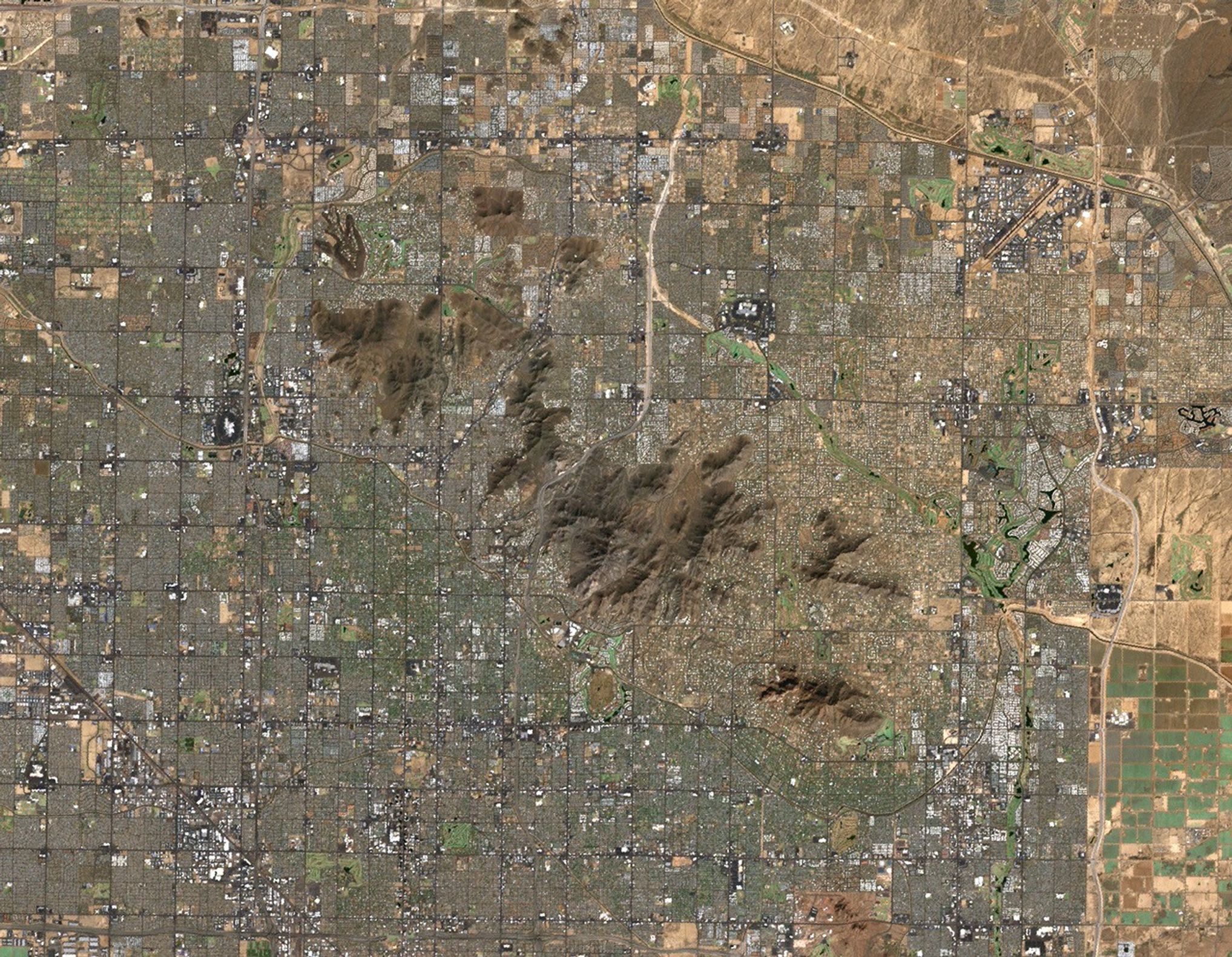 In the above Landsat 7 image, the rough terrain of the Phoenix Mountain Preserve areas stands out against the regular grid of city streets, grey buildings, and green irrigated areas (such as ornamental trees and golf courses). Data from the Landsat satellites are used to monitor urban growth, providing city planners and citizens with the information needed to guide development.