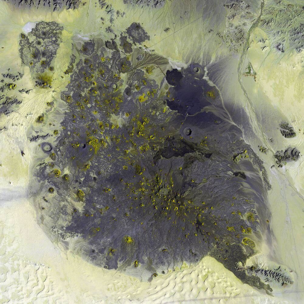 This image of the park was captured by the Landsat 7 satellite on December 5, 2002, using bands 7, 5, and 2. The dark cinders covering the lava plain dominate the center of the scene, and numerous circular craters are visible. To the south, the sands of the Sonora Desert are carved into sinuous dunes. At top center, a diagonal gray line marks a road that runs toward the Mexico-U.S. border.