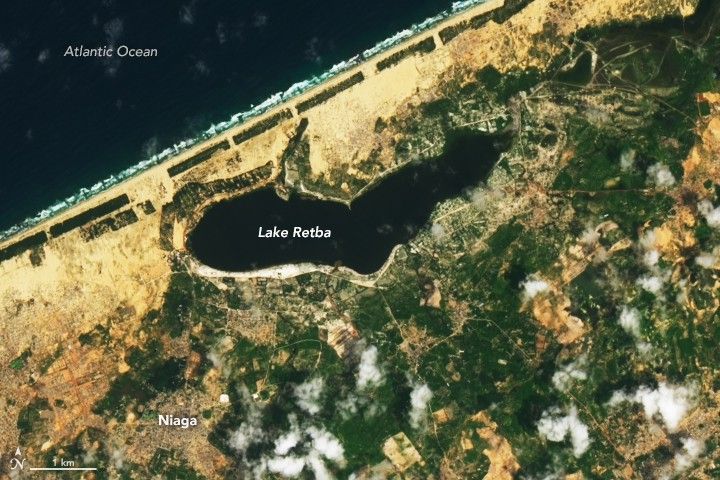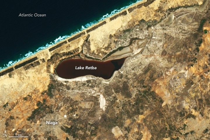 Along the coast of Senegal in West Africa, just a kilometer of beach separates the bright pink waters of Lake Retba from the dark blue-green waters of the Atlantic Ocean. But conditions at the lake (also called Lac Rose) are not always so rosy.