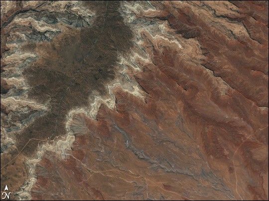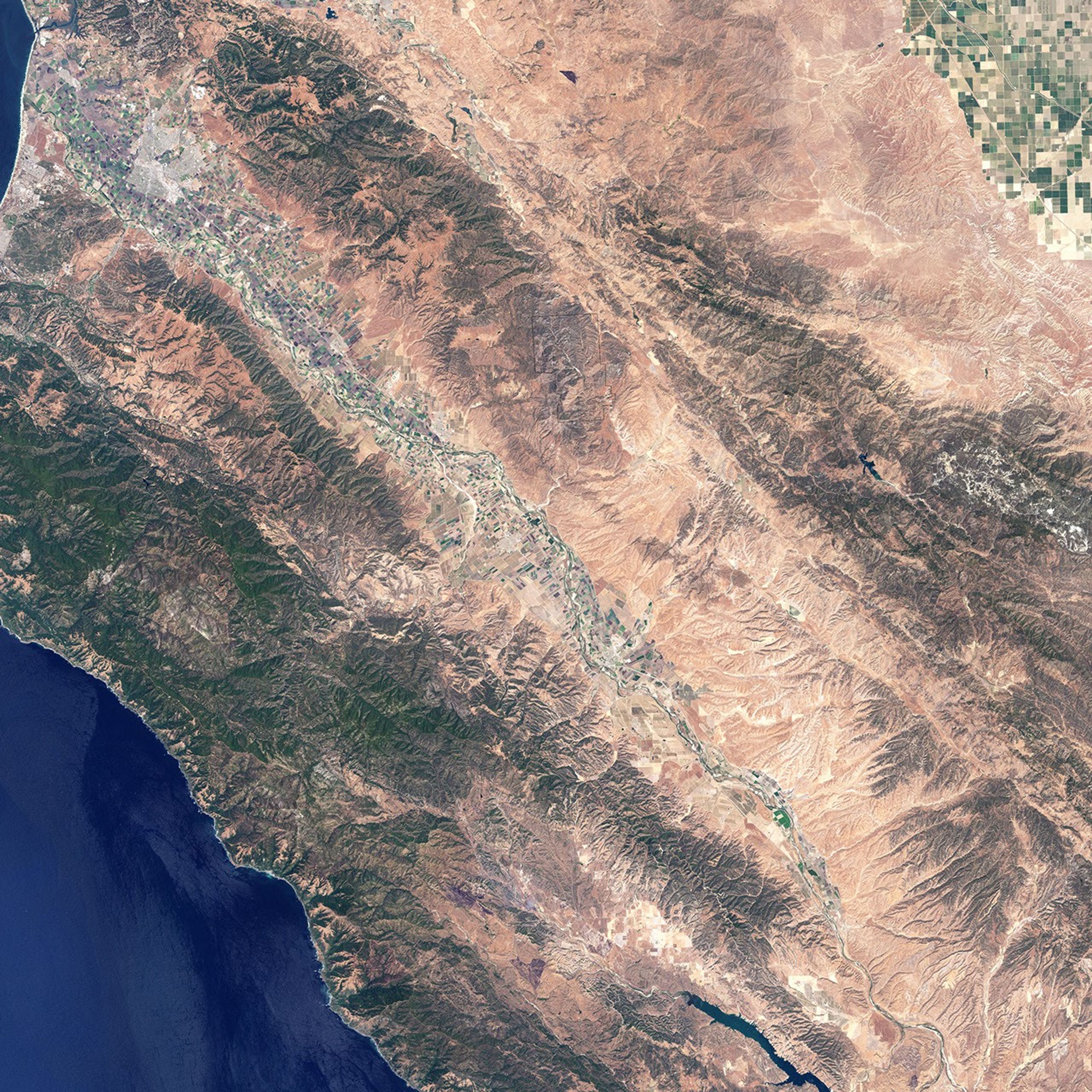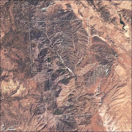 The park’s rugged landscape gives this Landsat-7 image a wrinkled appearance. The plants that grow in this arid region are brown from the summer heat. Most of these plants are chaparral, plants adapted to arid climates, but pine and oak forests and grasslands also grow in the monument. The region has hot, dry summers with cool winters in which moderate rain falls. During the winter and spring rains, the mountains are green, dotted with wildflowers in the spring. When the rains stop, the region quickly turns brown. This image was taken on June 19, 2001, well after the end of the rainy season.