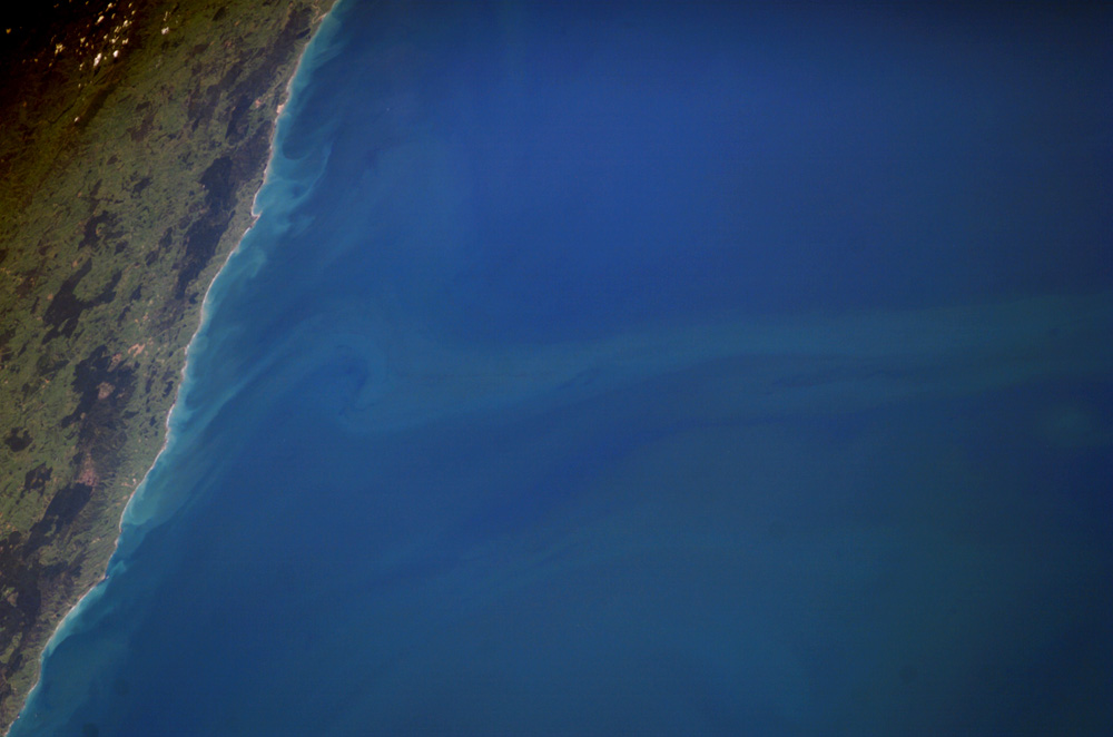 Smaller, brightly colored eddies along the coastline are sediment plumes generated by wave action and supplied by rivers. The coastal sediment patterns reveal the precise location of the convergence zone. Castlepoint marks a change in coastline orientation but also a change in nearshore current direction: south of Castlepoint sediment is moved by the north-flowing Antarctic Circumpolar Current. But north of Castlepoint, nearshore sediment is transported southwards by currents in the subtropical waters, before being caught up in the Antarctic Circumpolar Current (arrows indicate current directions).