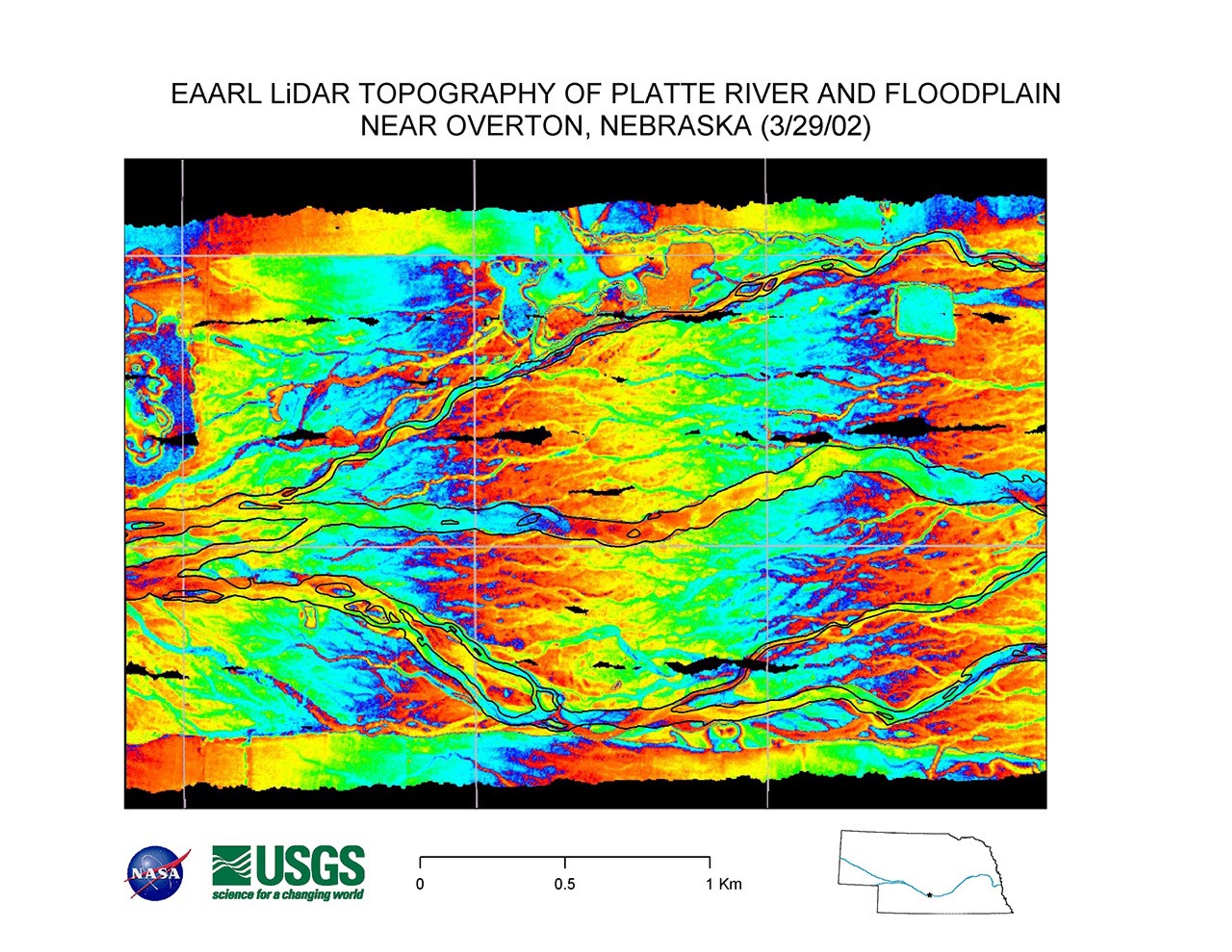 On March 29, 2002, they collected LiDAR data of the Platte River and floodplain near Overton, Nebraska. The image shows channels of water as ribbons of color. The present Platte River channel is shown outlined in black. The river flows downhill from west to east, so the west end is higher than the east. In order to show this elevation change as well as all of the subtle features of the river bottom, Wright “wrapped” the color bar. Starting on the east (right), blue is the lowest elevation going up to red, 3 meters above that. Then, blue begins to represent 3 meters and red, 6 meters, and so forth. The effect is a rainbow of color going from east to west. Sandbars appear as wider, more solid areas. The gridlines on this image mark out 1 square kilometer per box.