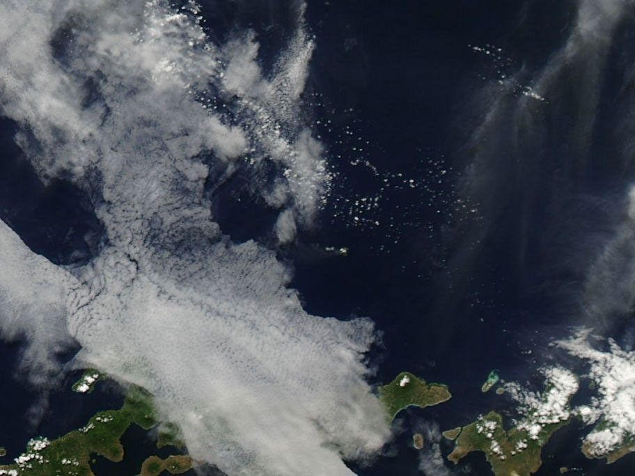 A small gray cloud—suggestive of ash emissions—lingered above Batu Tara Volcano on August 6, 2010. A large-scale view from a different satellite instrument [the Moderate Resolution Imaging Spectroradiometer (MODIS)] on the same day shows the plume extending due west from Batu Tara before disappearing under a blanket of clouds. Batu Tara has been active since January 2007. Since then the volcano has sent plumes of ash and steam into the air, sometimes in short bursts, occasionally in a near-continuous stream. Located about 55 kilometers (34 miles) from the nearest large island, activity at Batu Tara is monitored primarily by satellite. This natural color image was acquired by the Advanced Land Imager (ALI) aboard the Earth Observing-1 (EO-1) satellite.