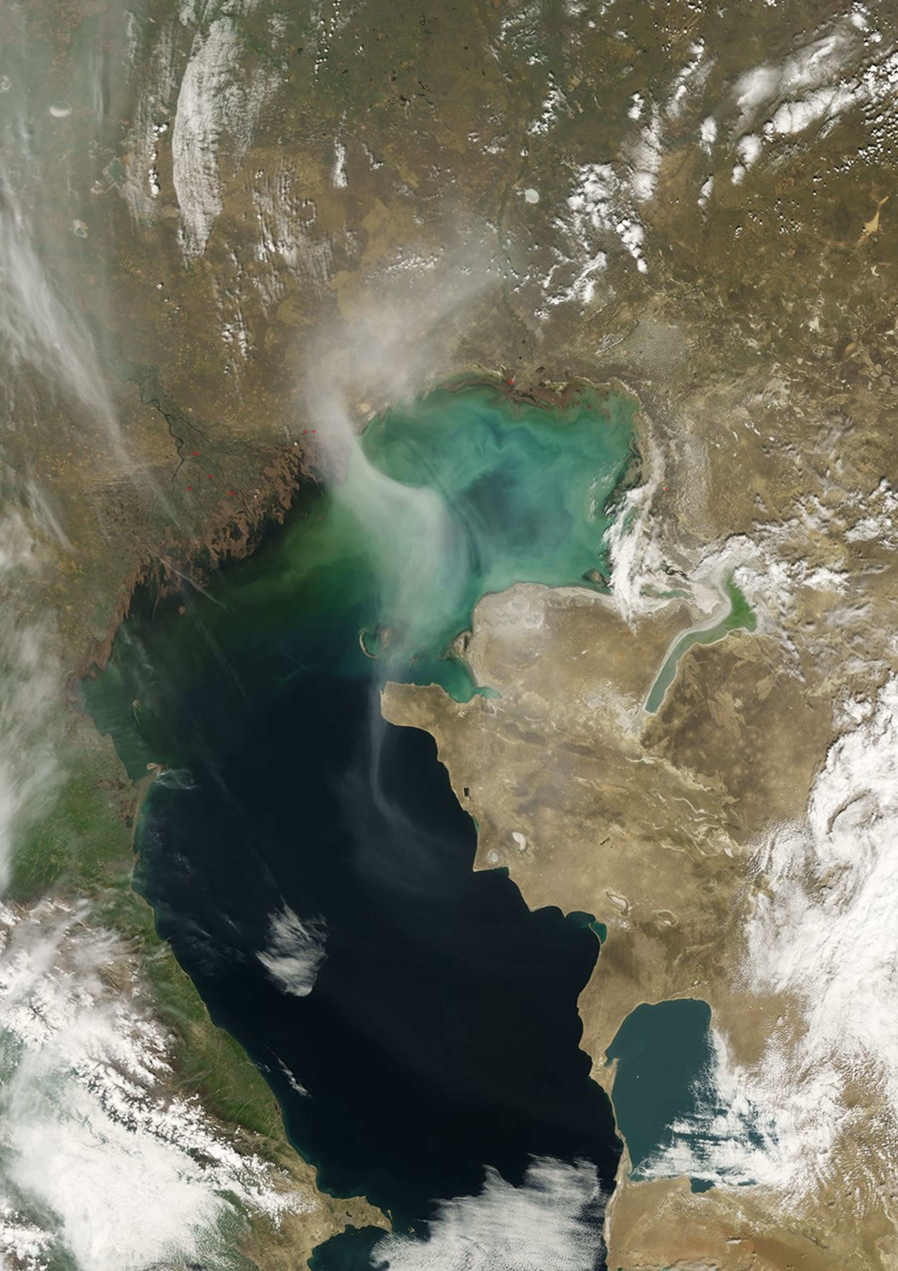 A hazy plume drifted over the northern end of the Caspian Sea in early April 2008. The Moderate Resolution Imaging Spectroradiometer (MODIS) on NASA’s Terra satellite took this picture on April 12, 2008. This image shows the plume curving over the water’s surface. Underneath the plume, much of the water appears blue-green, thanks to the Sea’s shallow northern depths. This part of the Caspian Sea has an average depth of just 4 to 8 meters (13 to 26 feet). Farther south, the deeper water is dark blue.