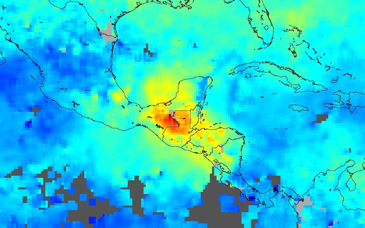 The highest mixing ratios are seen over the Yucatan Peninsula and over the border between Mexico and Guatemala. Carbon monoxide levels as high as 360 parts per billion by volume of air (red pixels) were measured. The orange and yellow pixels indicate high levels of CO over the countries south of Guatemala—Honduras, El Salvador, and Nicaragua. The pollution is also being carried northeastward over the Gulf of Mexico toward the U.S. gulf coast states and the western parts of the Caribbean.