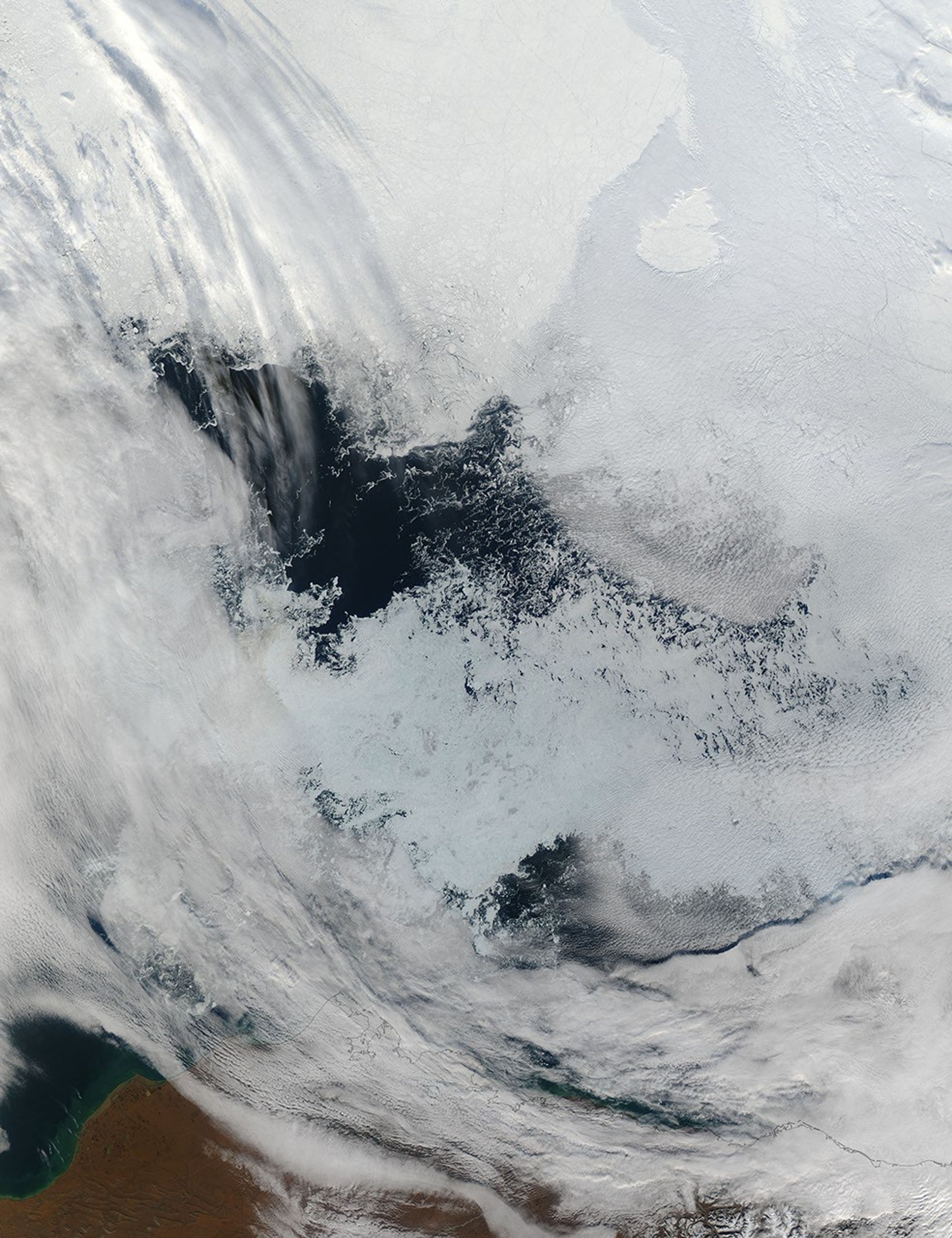 The Beaufort Sea polynya of 2006 formed in mid-August and continued to grow through early September. By September 11, 2006, the area of open water had grown to roughly the size of the state of Indiana—about 100,000 square kilometers (38,000 square miles). The Moderate Resolution Imaging Spectroradiometer (MODIS) on NASA’s Aqua satellite took this picture the same day. The top image shows the polynya and its immediate surroundings. In this image, the polynya appears as a sprawling black shape in the sea ice, the dark waters of the Arctic Ocean making a sharp contrast to the bright white expanse of sea ice that covers Earth’s northernmost latitudes.