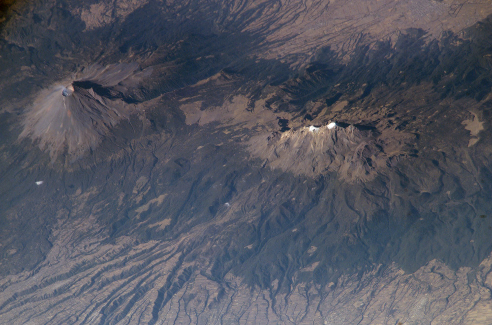 As part of the circum-Pacific “Ring of Fire,” Mexico hosts several of the world’s most continually active volcanoes, including the massive Popocatepetl (Aztec for “smoking mountain.”) This detailed, oblique astronaut photograph also depicts a neighboring volcano, Iztaccíhuatl (the “Woman in White.”) With North to the right in the scene, the view is a westward-looking perspective.