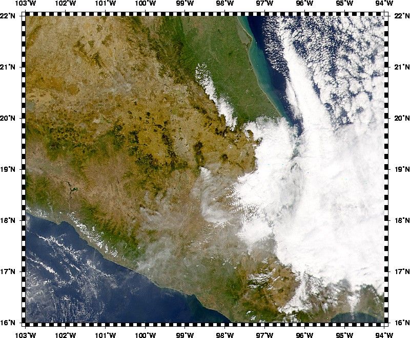 This true-color image of the volcano was acquired today by theSea-viewing Wide Field-of-view Sensor (SeaWiFS) flying aboard theOrbView-2 satellite. In this image, Popocatepetl’s plume (greyishpixels) can be seen blowing southward, away from Mexico City. There isa large cloud bank (bright white pixels) just to the east of thevolcanic plume.