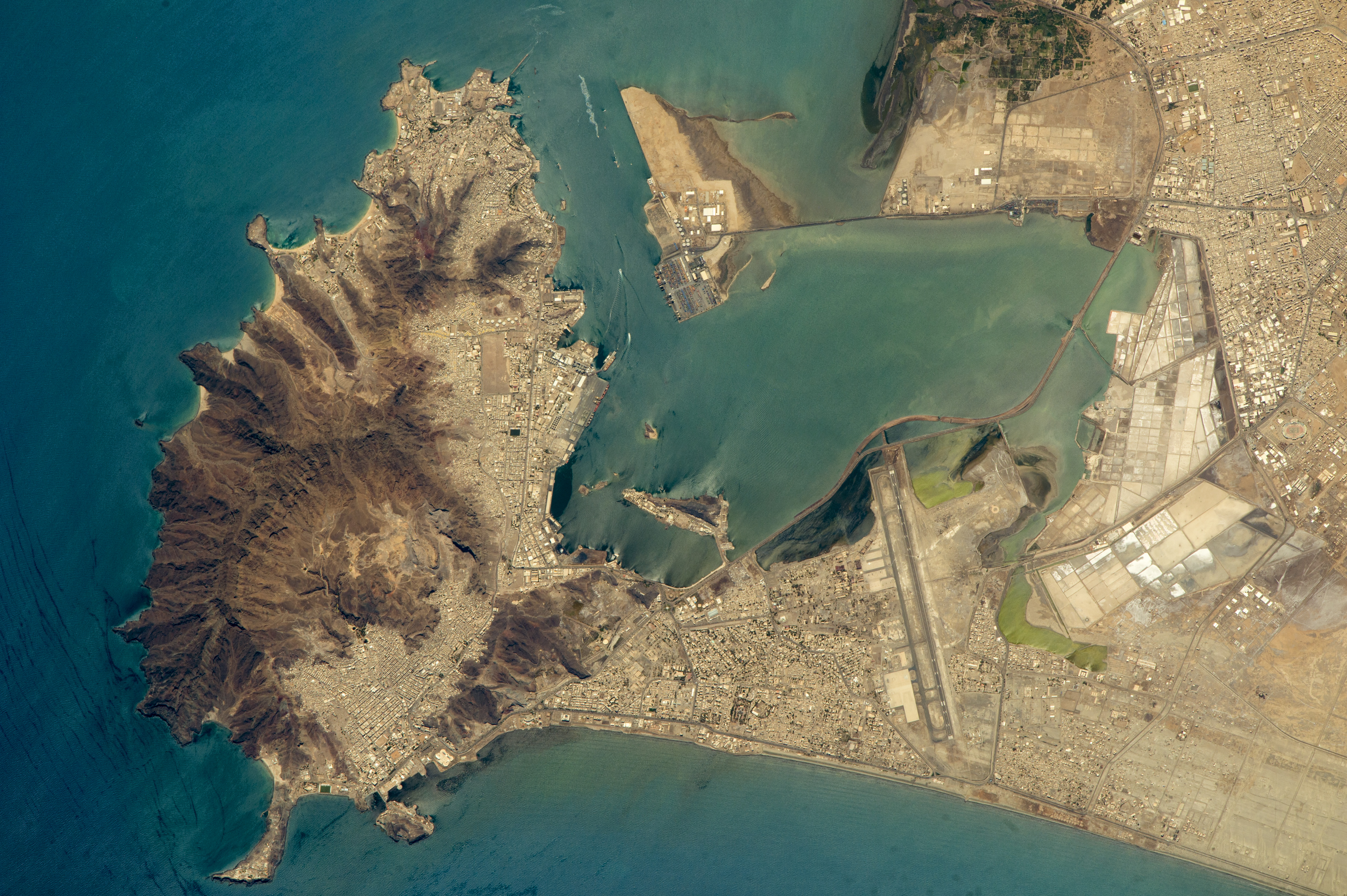 Orbiting almost directly over the port of Aden, an astronaut aboard the International Space Station (ISS) took this photograph of the rugged, extinct volcano, the flat sand spit next to it, and the big bay that now all form the port of Aden. Part of the city (just south of the volcano) is known as the Crater neighborhood, and residents can look downhill onto the docks of the old port and the Sira Fortress, an 11th century fortification on a small island just offshore.