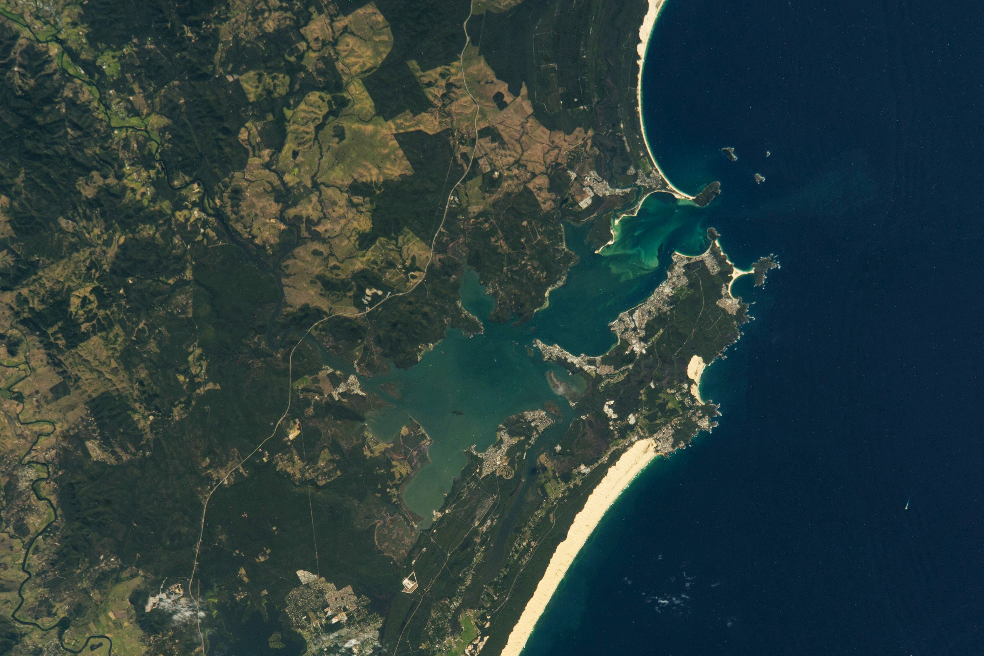 An astronaut aboard the International Space Station took this photograph of Port Stephens Bay in New South Wales along the southeastern coast of Australia. The bay, named in 1770 by Captain Cook, is located 160 kilometers (100 miles) north of Sydney.