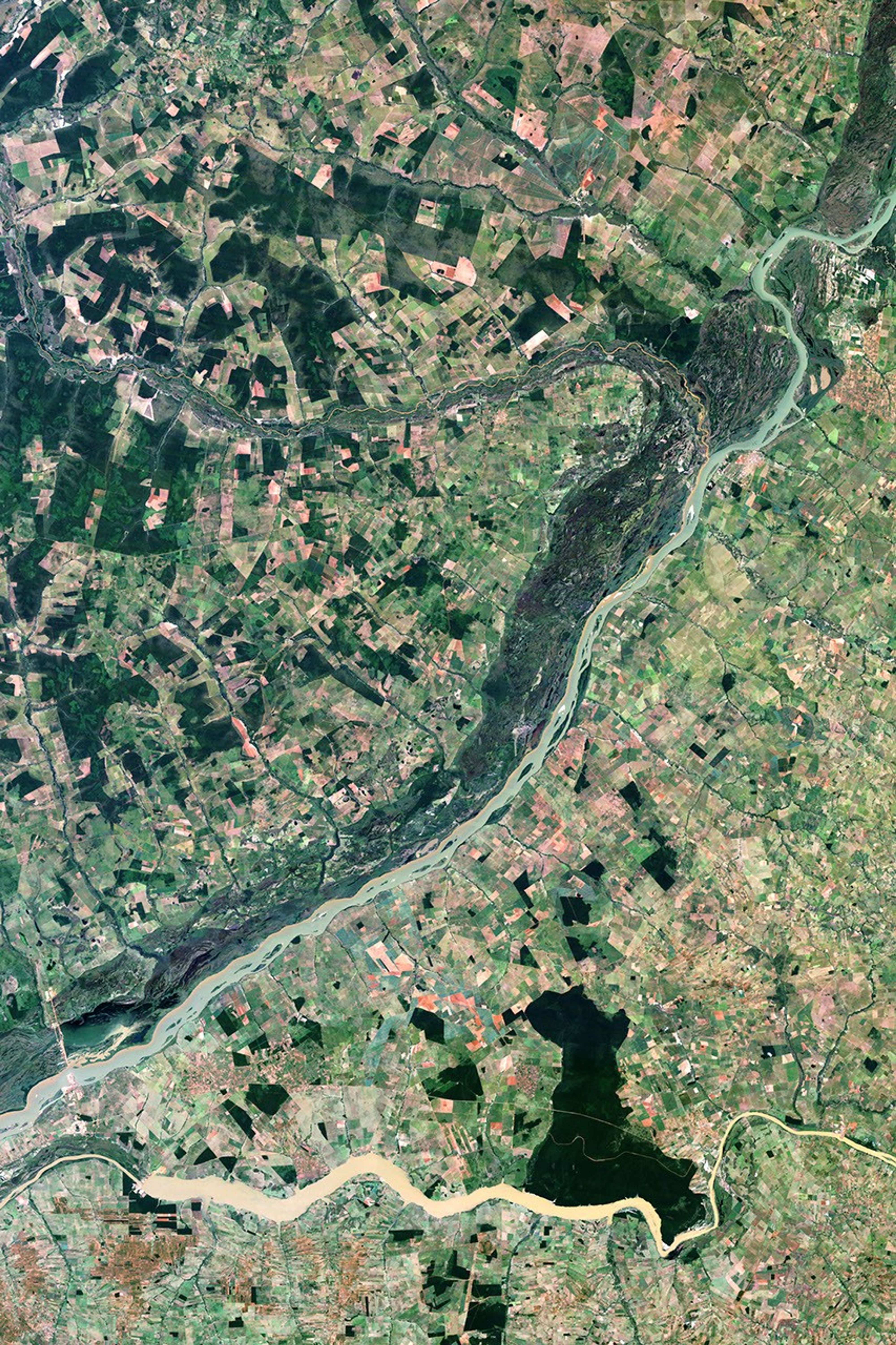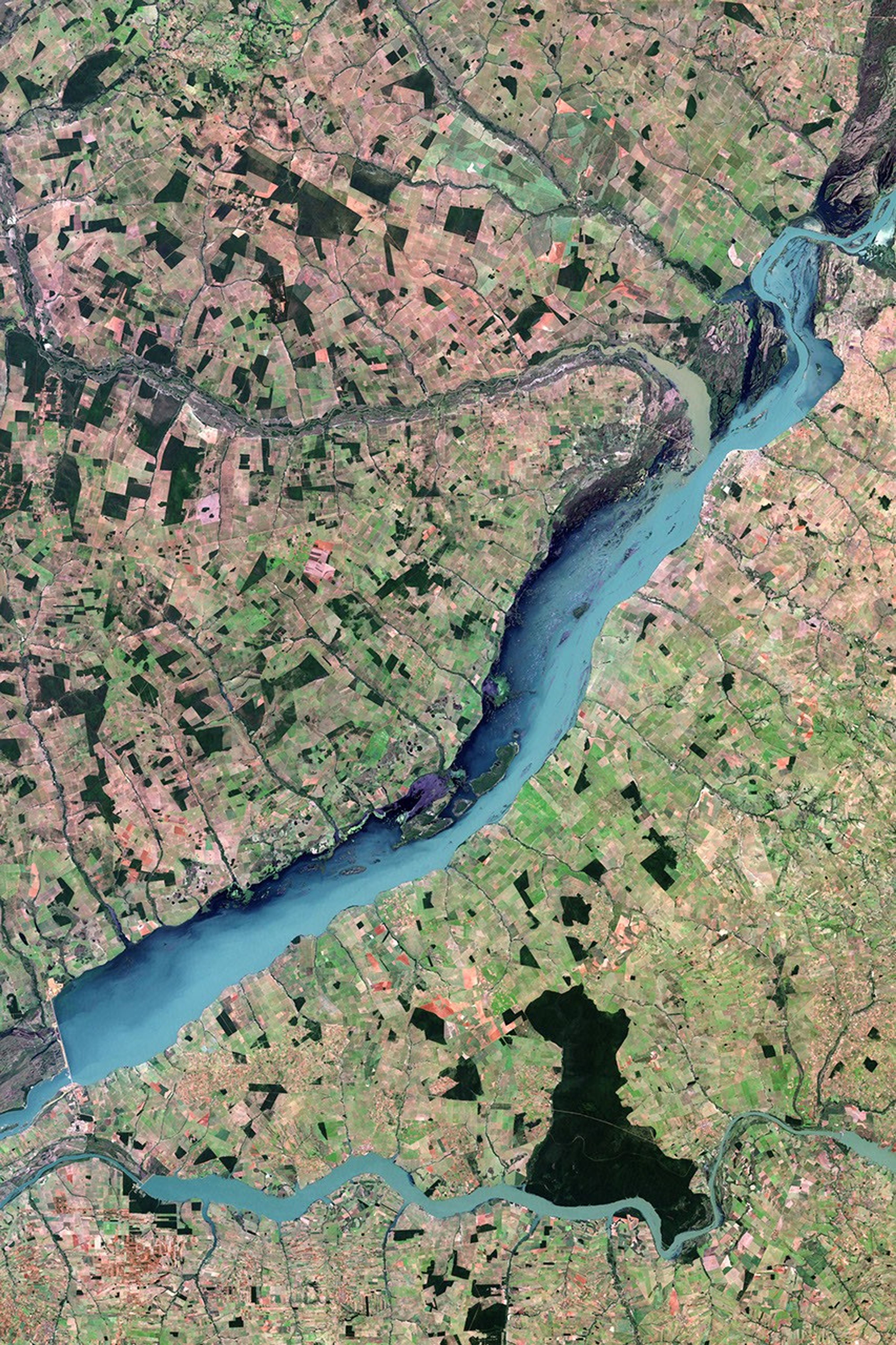 NASA’s Landsat satellite captured these images before and after the dam began filling Porto Primavera Reservoir. Landsat 5 acquired the top image on March 14, 1987, and Landsat 7 acquired the bottom image on May 12, 2000. The top image shows the Paraná River flowing unimpeded through the incomplete dam, which cuts partway across the river from the north. In this image, the relatively shallow river allows numerous islets to poke above the water’s surface. The bottom image shows the reservoir created by the dam. In this image, the reservoir covers a much wider area, and many of the islets that had been visible in the top image no longer appear.