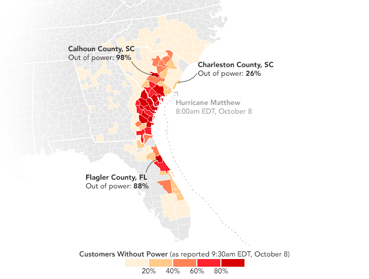 As of 1:00 p.m. Eastern Daylight Time on October 8, 2016, Florida Power & Light Company reported that 400,000 customers were without power. In Georgia, 272,000 Georgia Power customers were in the dark. South Carolina Gas & Electric had 268,000 customers without power; Duke Energy had an additional 70,000 customers in the dark in South Carolina and 84,000 in North Carolina. The map above is based on data from the power companies. In particular, Flagler County, Florida, and Calhoun County, South Carolina suffered many outages.