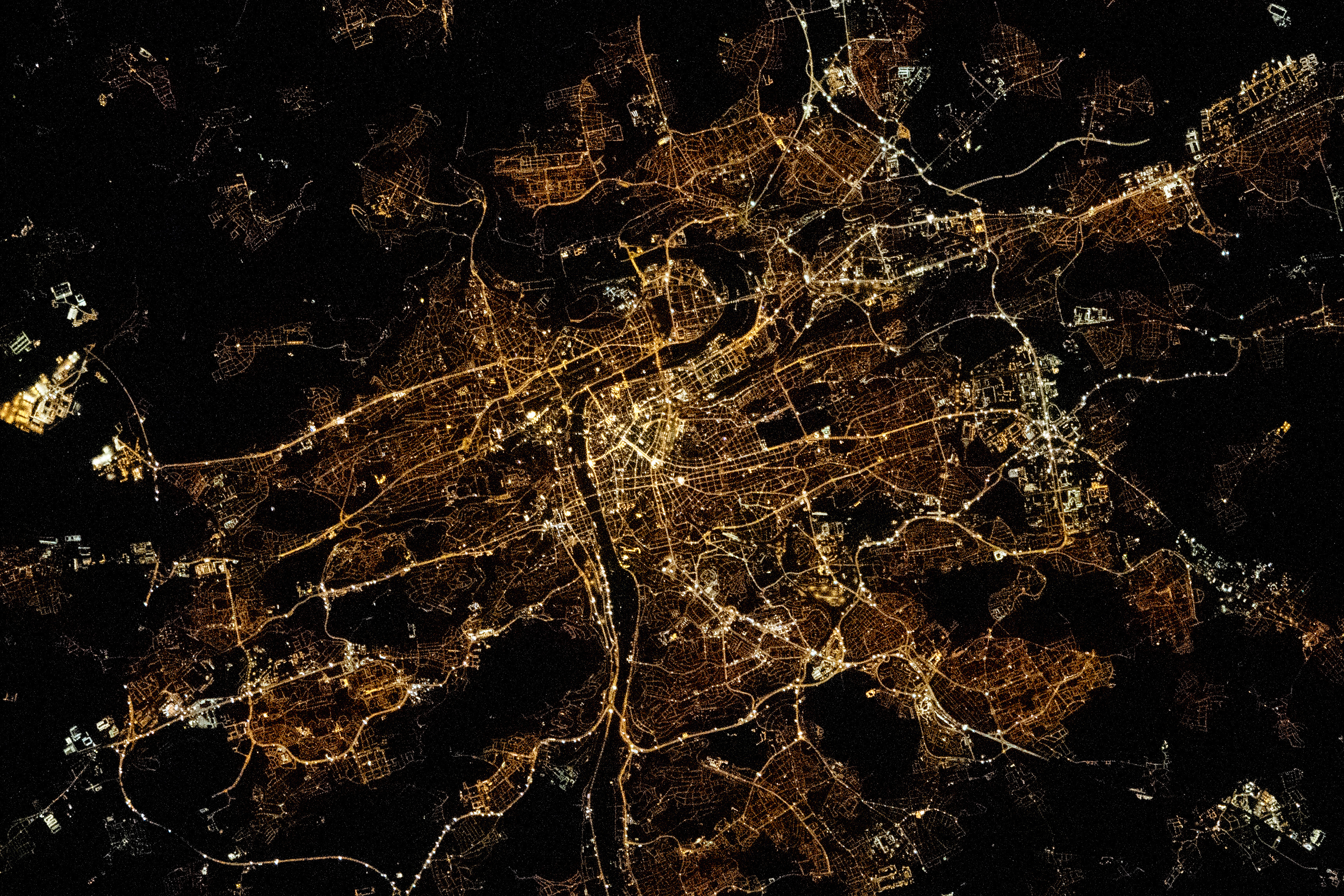 The dark meandering Vltava River contrasts with the bright lights of the city. The river flows for approximately 31 kilometers (19 miles) through the center of Prague and is crossed by 18 bridges that link each side of the city. Several of these bridges are visible as narrow strips of bright artificial lights in the full-resolution version of the photo.
